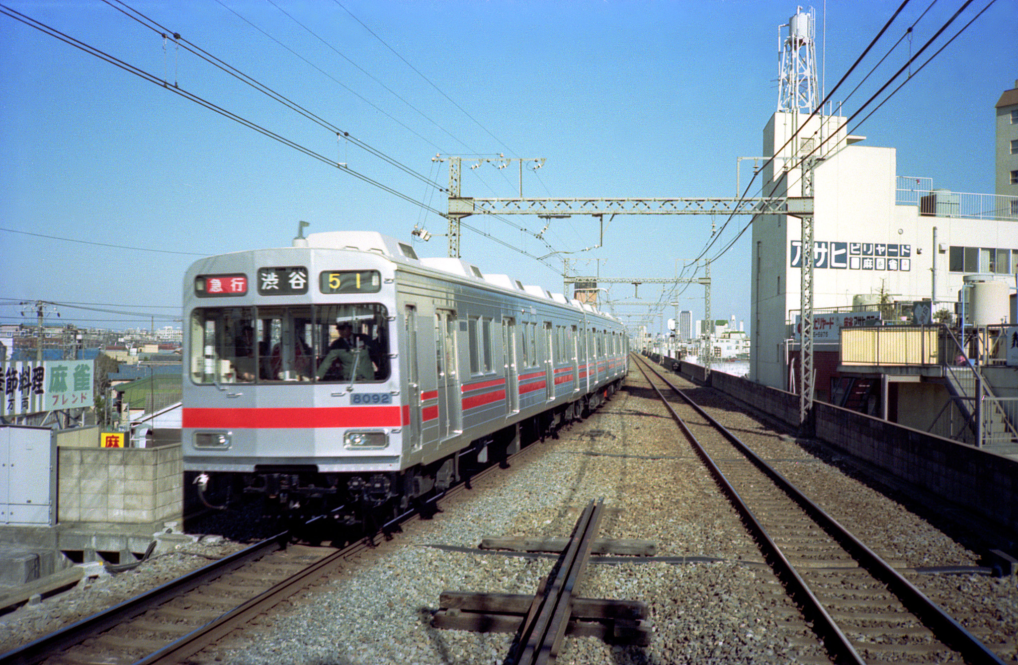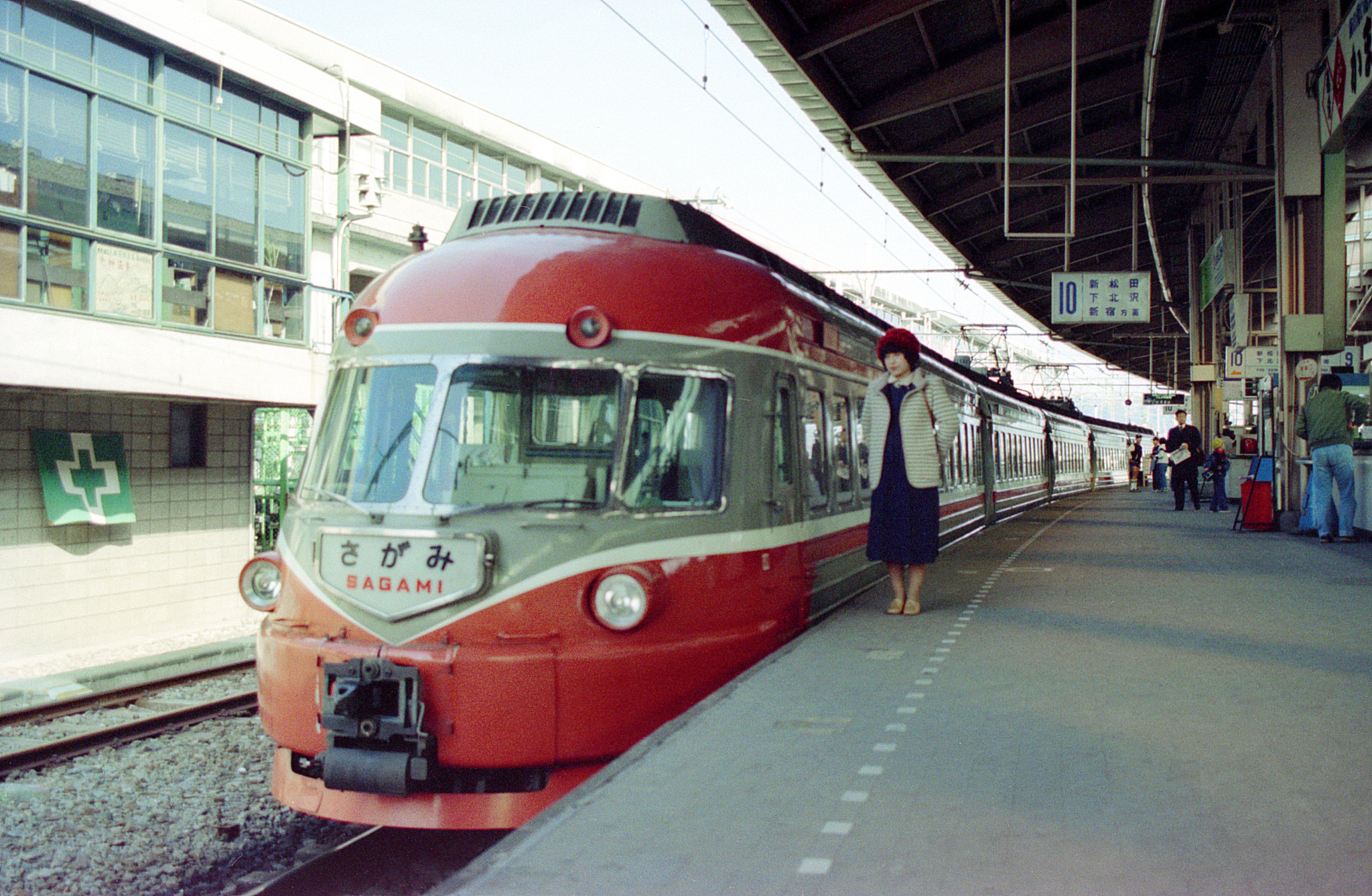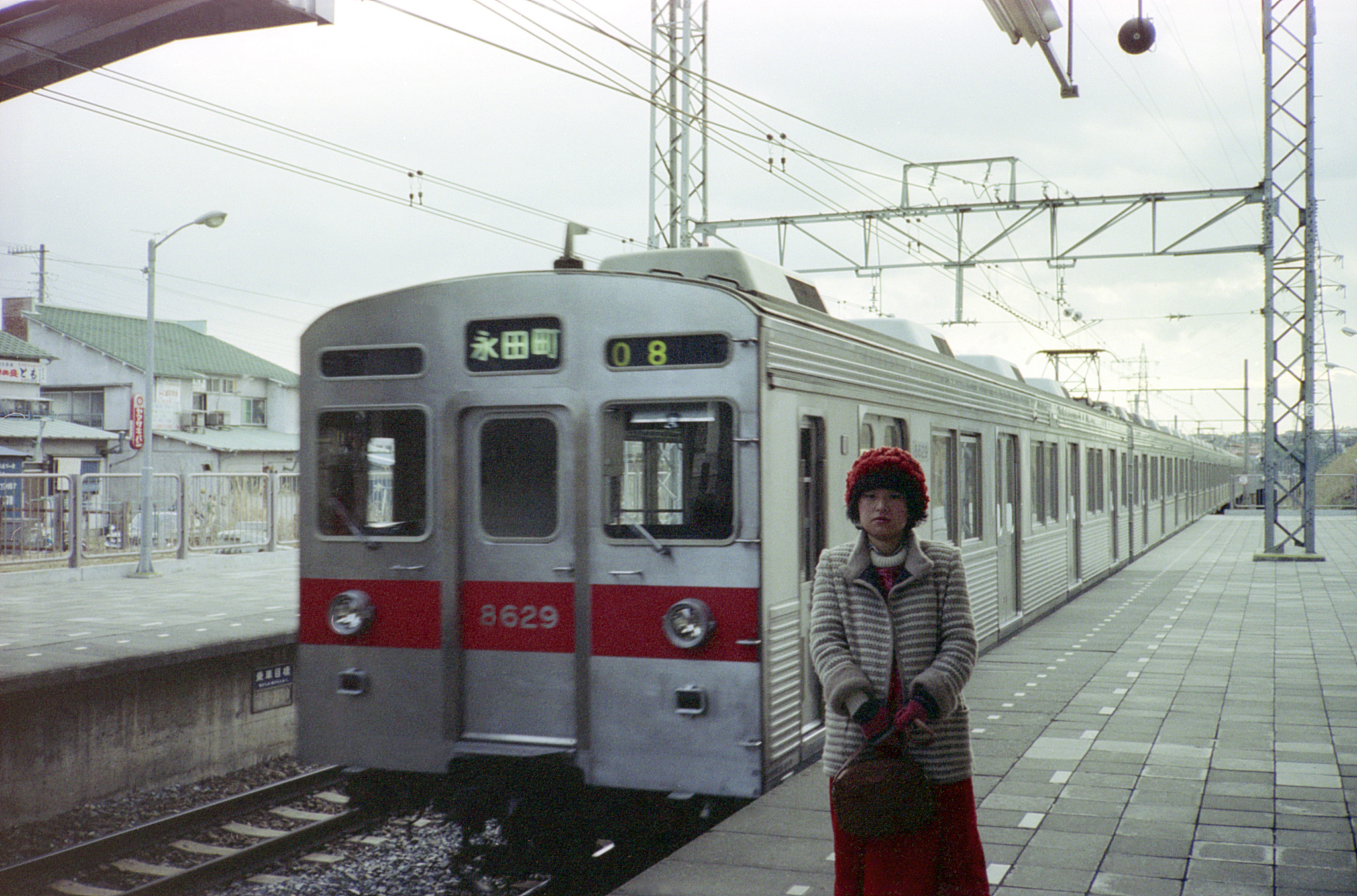 昭和56年が始まりました。所帯を持って初めてのお正月。元日は自宅の近く、瀬谷区相沢の諏訪神社へ夫婦二人で初詣に行きました。そして1月3日には、調布の実家を訪ねます。途中、自分たちの仲人をして下さった、両親の恩師のお宅へ、新年のご挨拶に伺いました。昨年までは父や姉と一緒に元日に訪ねていた、お正月恒例の学芸大学駅。訪問後は渋谷へ出ますが、乗らずに見送ったらしい急行列車は、8090系という新しい形式でした。小田急の7000形と同じく、前年末の12月27日から営業運転を開始した電車で、走り始めてまだ8日目ということになりますね。ステンレスカーでも、直線的だった8000系と比べ、下膨れで曲線的な形状。しかも赤帯を巻いて、ソフトな印象になりました。