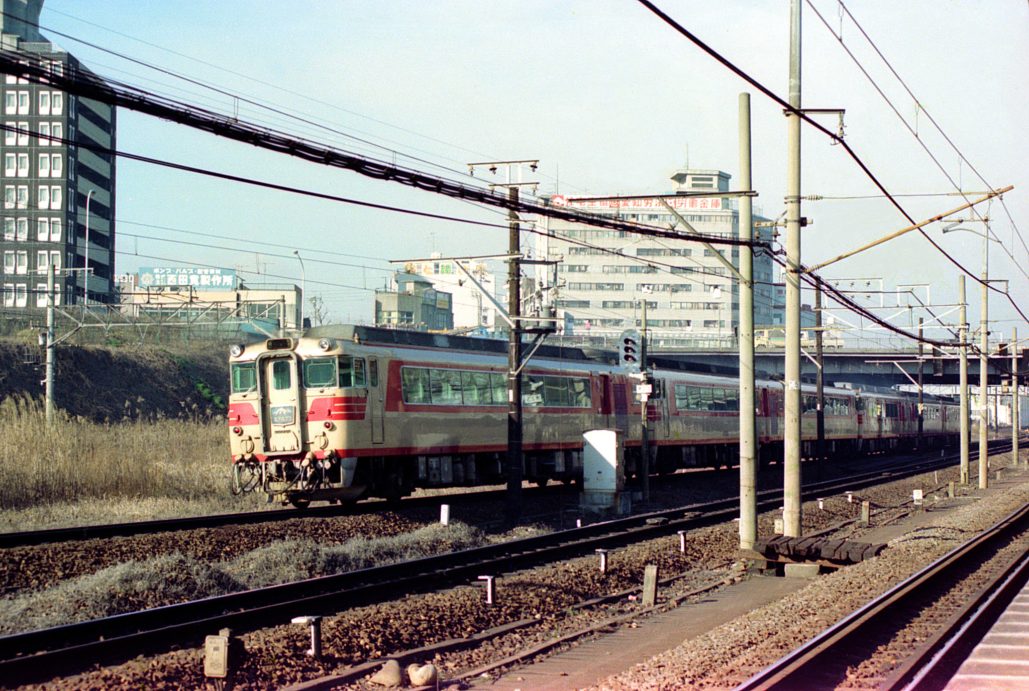 いきなり登場した名鉄の気動車特急「北アルプス」号。やはり小田原から名古屋まで新幹線に乗ったようです。そして中央本線に乗換え、一駅戻る形で「金山」駅のホームに立っています。名鉄のキハ8000系は、国鉄高山本線に直通する準急「たかやま」号の車輛として昭和40年に生まれ、翌年急行に変更。昭和44年に増備された後、45年には富山地方鉄道に乗入れて遠く「立山」駅まで直通する「北アルプス」号が誕生します。51年には特急に格上げされ、国鉄の気動車特急に似た塗分けに変更されました。背景の橋は「新橋」ですが、当時この場所には中央本線の駅しかありません。8年半後の平成元年に、左手に名鉄および東海道本線の駅が併設されて「金山総合駅」が開業します。