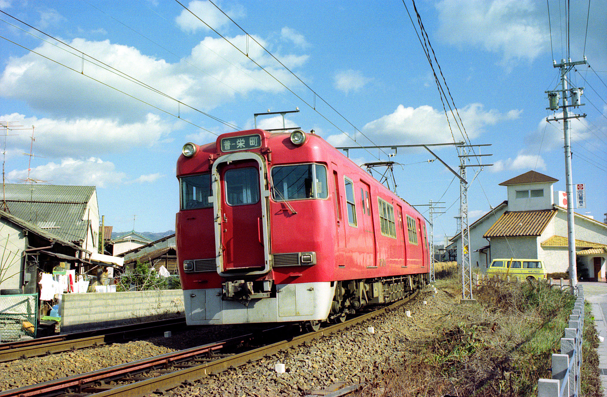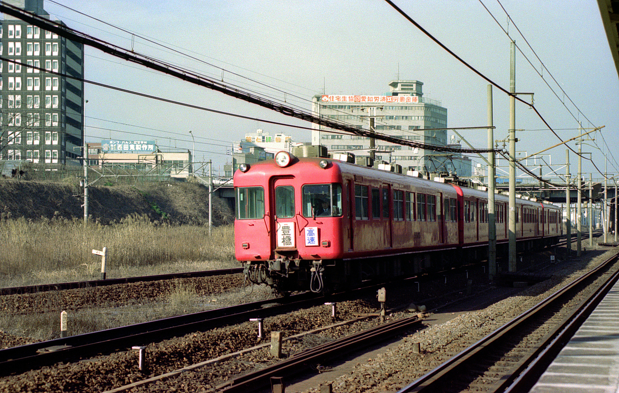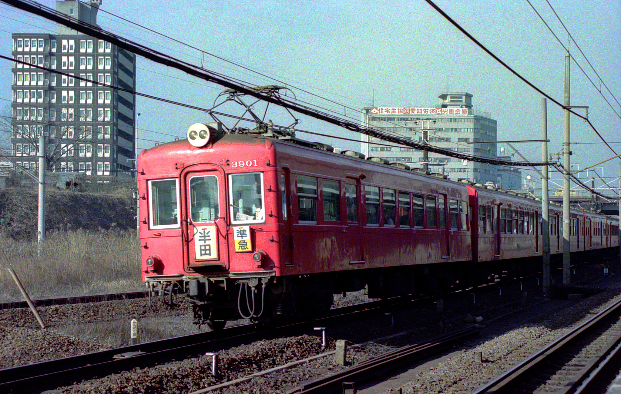 今度は新名古屋方向から準急の半田行きが走って来ました。自分にとって名鉄は、関東の私鉄にも劣らないほど縁の深い存在でしたが、3900系の写真は初めて撮ったように思います。戦後のロマンスカーの嚆矢とも言える3850系の流れを受けて昭和27年に登場したセミクロスシートの特急用車輛ですが、この当時は一般車に格下げされていて、OR車(オールドロマンスカー)とも呼ばれていたそうです。ところで、列車種別板の「準急」表示は下半分が黄色地のようですが、前年夏に準急列車(3850系)に遭遇した際は、オレンジ色の板に白文字の表示でした。この半年の間に名鉄の種別表示のフォーマットが変更されたのでしょうか。それとも、路線や列車による違いだったのでしょうか。