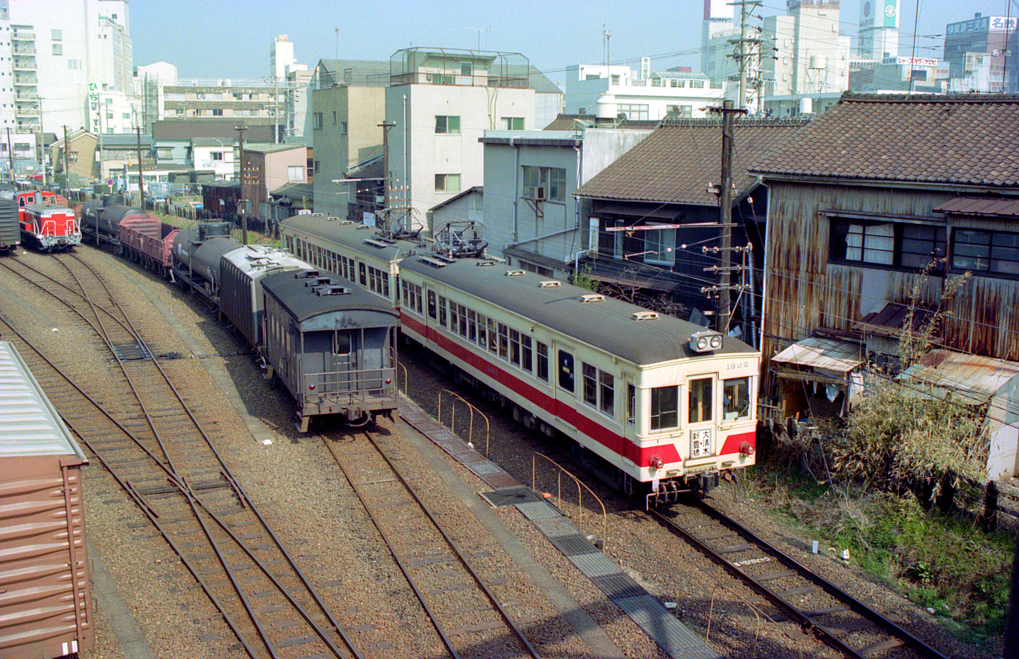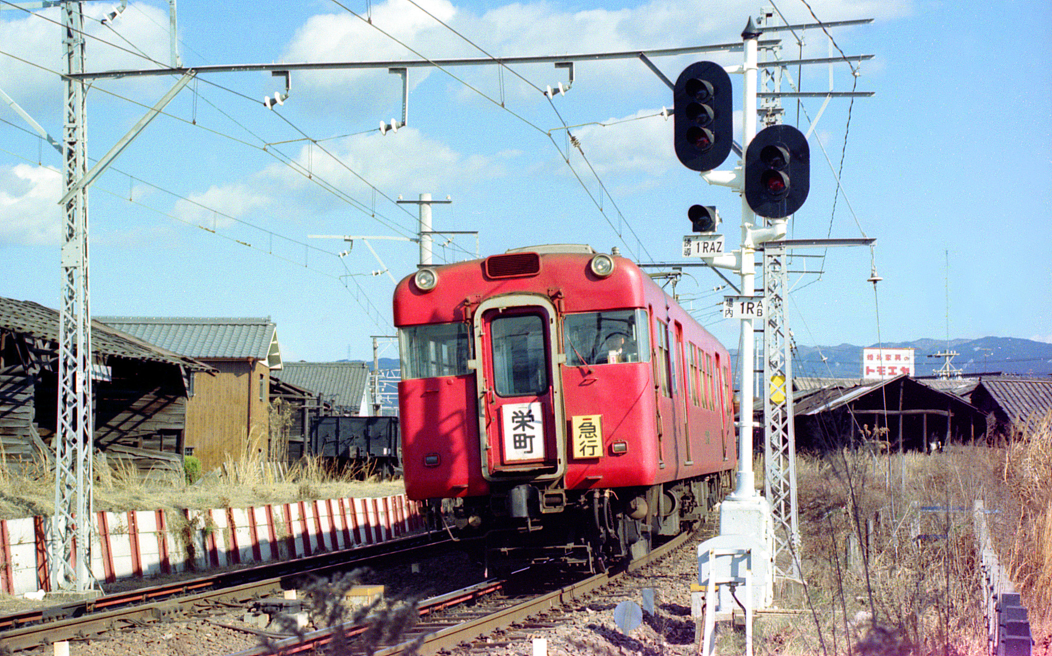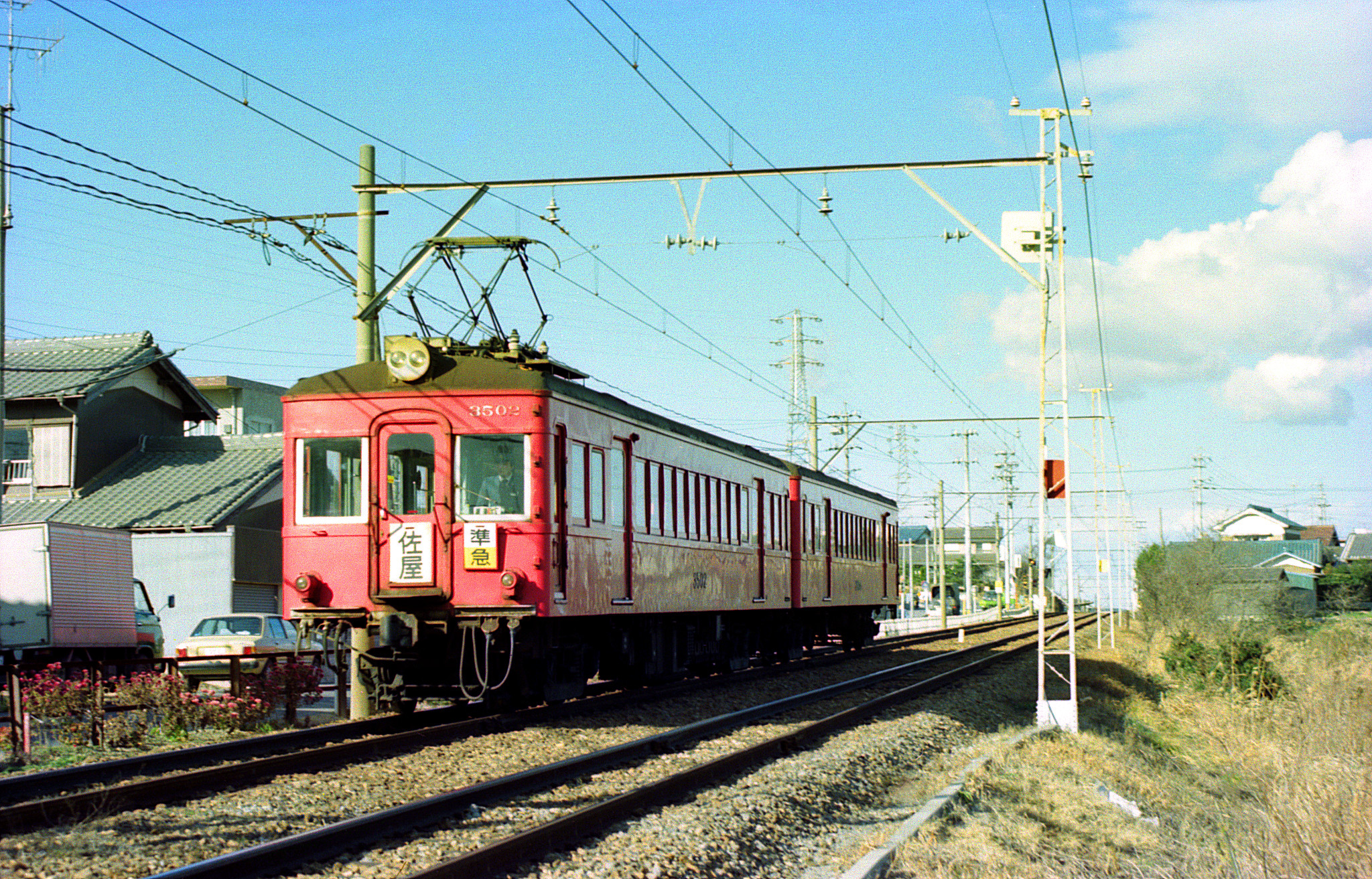 今度は新名古屋方向から準急の半田行きが走って来ました。自分にとって名鉄は、関東の私鉄にも劣らないほど縁の深い存在でしたが、3900系の写真は初めて撮ったように思います。戦後のロマンスカーの嚆矢とも言える3850系の流れを受けて昭和27年に登場したセミクロスシートの特急用車輛ですが、この当時は一般車に格下げされていて、OR車(オールドロマンスカー)とも呼ばれていたそうです。ところで、列車種別板の「準急」表示は下半分が黄色地のようですが、前年夏に準急列車(3850系)に遭遇した際は、オレンジ色の板に白文字の表示でした。この半年の間に名鉄の種別表示のフォーマットが変更されたのでしょうか。それとも、路線や列車による違いだったのでしょうか。