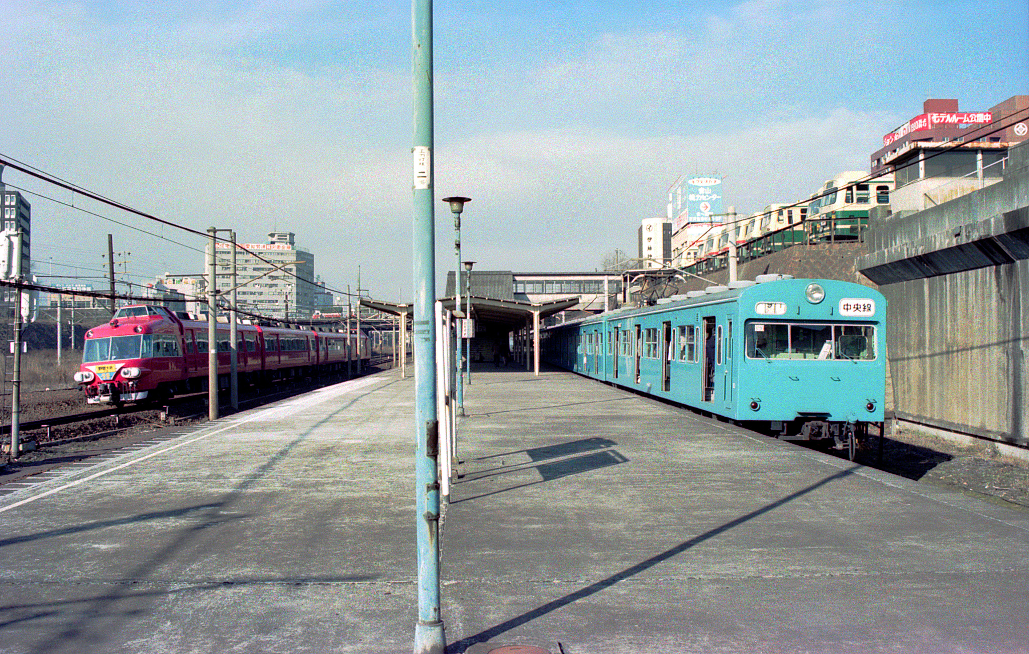 ここ数回の写真は中央本線(西線)のホームの上から撮っていますが、当時の「金山」駅は、この島式ホーム1面だけでした。すぐ横を名鉄名古屋本線と国鉄東海道本線が走っていますが、どちらにも駅は無く、名鉄は少し南(左手前)に「金山橋」駅、東海道本線の方は2kmほど南に「熱田」駅があるだけでした。平成元年に開催された「世界デザイン博覧会」を機に、名鉄の駅を移設、東海道線には新設して、新しい「金山」駅を開設します。一般には地下鉄も加えた「金山総合駅」と呼ばれるようになりました。横を行く名鉄パノラマカーは特急「野間大坊」号。知多新線の「野間」行きですが、偶然ながら、翌日の行動にも関連しています。…ん? それとも、この列車を見て触発されたのかな?