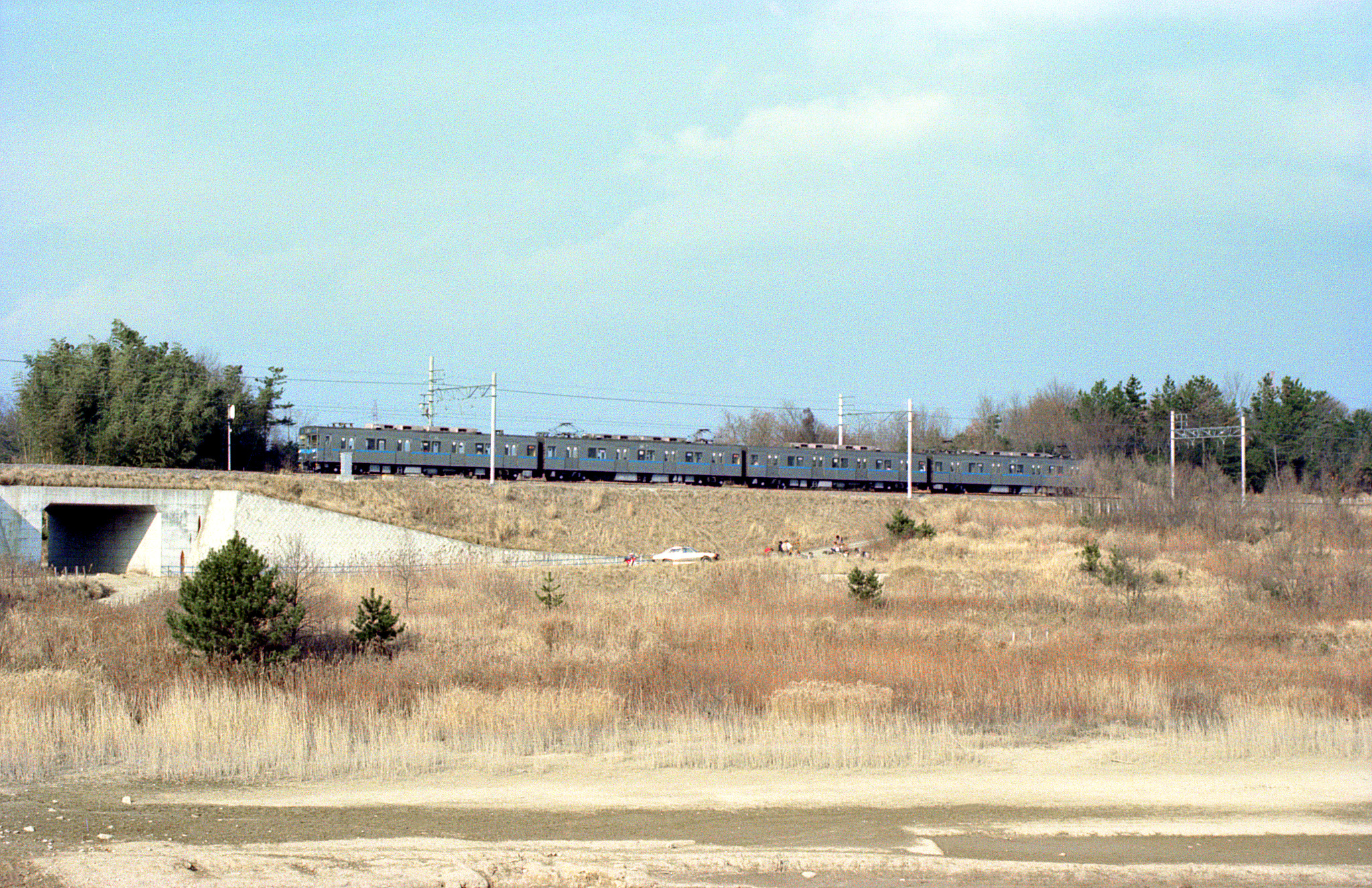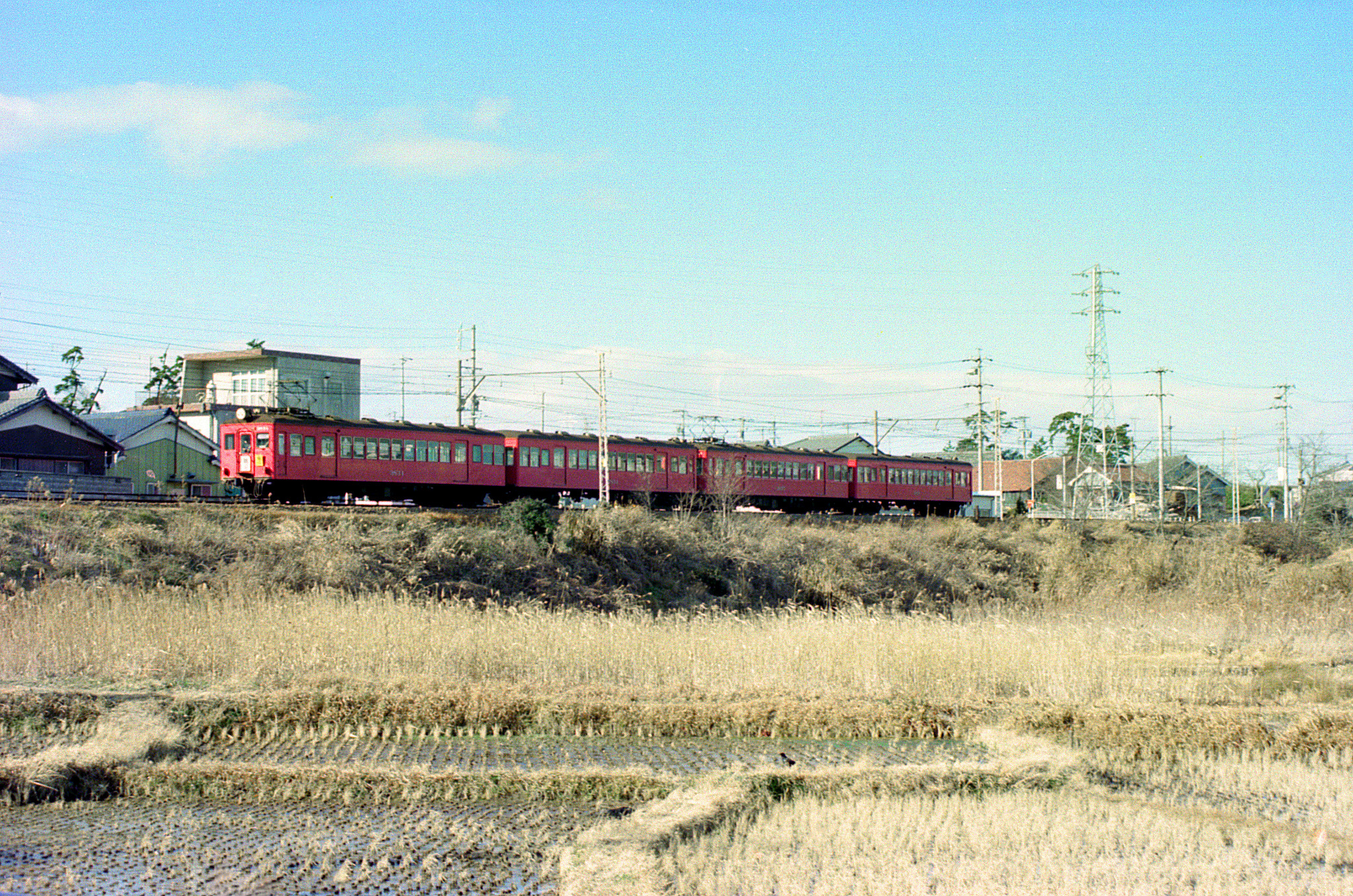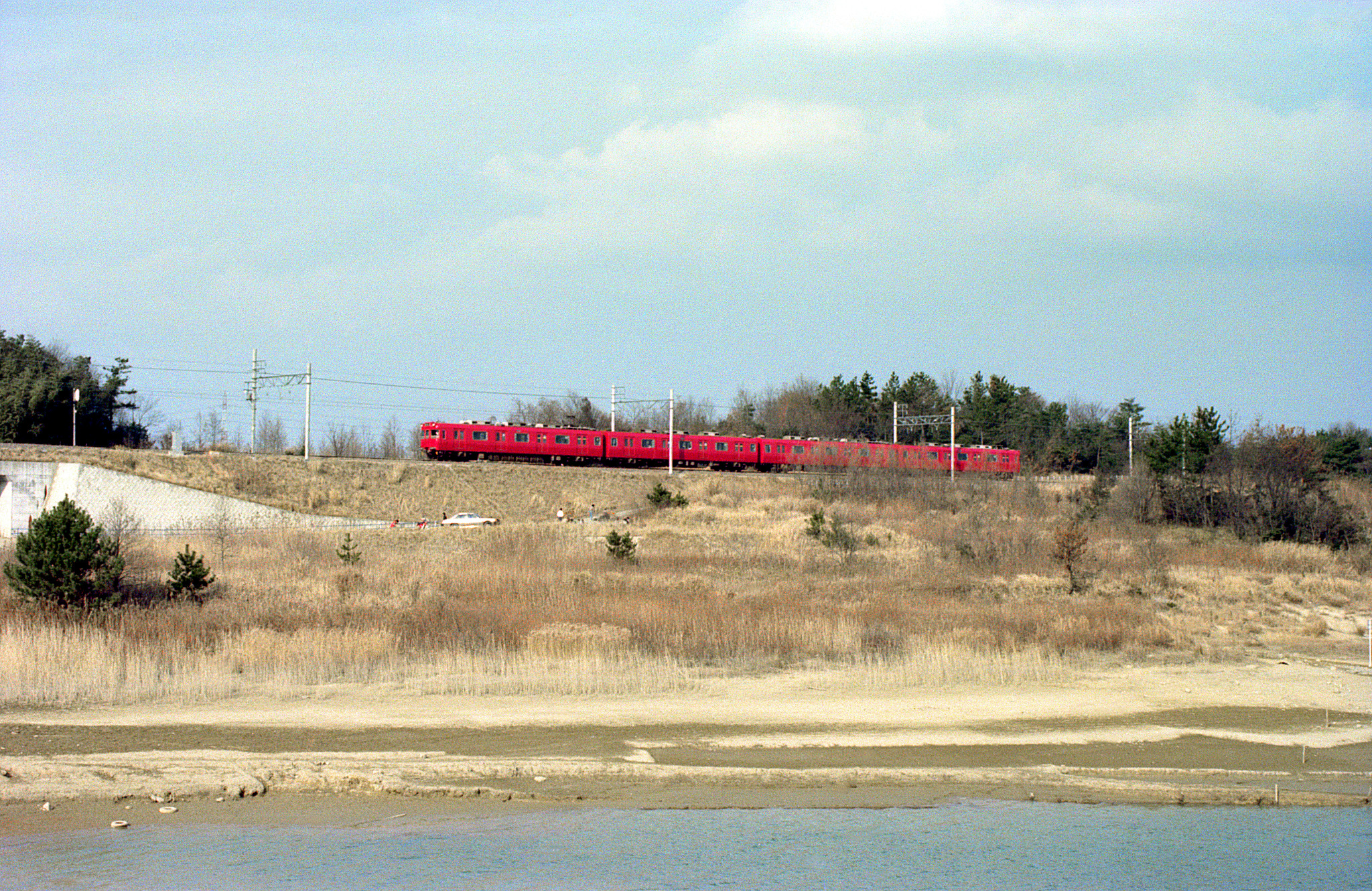実は、大雑把な地図で見て米野木・黒笹間には大きな池(愛知池)があることを知り、水面を舞台とした風情ある写真でも撮れるかと、知らない駅で下車してみたのですが、想像とは違って荒涼たる冬枯れの風景…と言うより殺風景な眺めが広がるだけでした。でも、名鉄の赤い電車(100系)は目立ちますね。名古屋市営地下鉄3号線の終点の赤池と名鉄三河線の梅坪とを結ぶこの区間の路線名は正式には「豊田線」で、踏切の無い高規格の路線ですが、一般には「豊田新線」と呼ばれていました。右が梅坪方面で、列車は豊田市発。この当時の地下鉄側の終点は伏見でしたが、年内には浄心まで延長され、将来(平成5年)は上小田井で接続して、名鉄犬山線とも直通運転を始めます。
