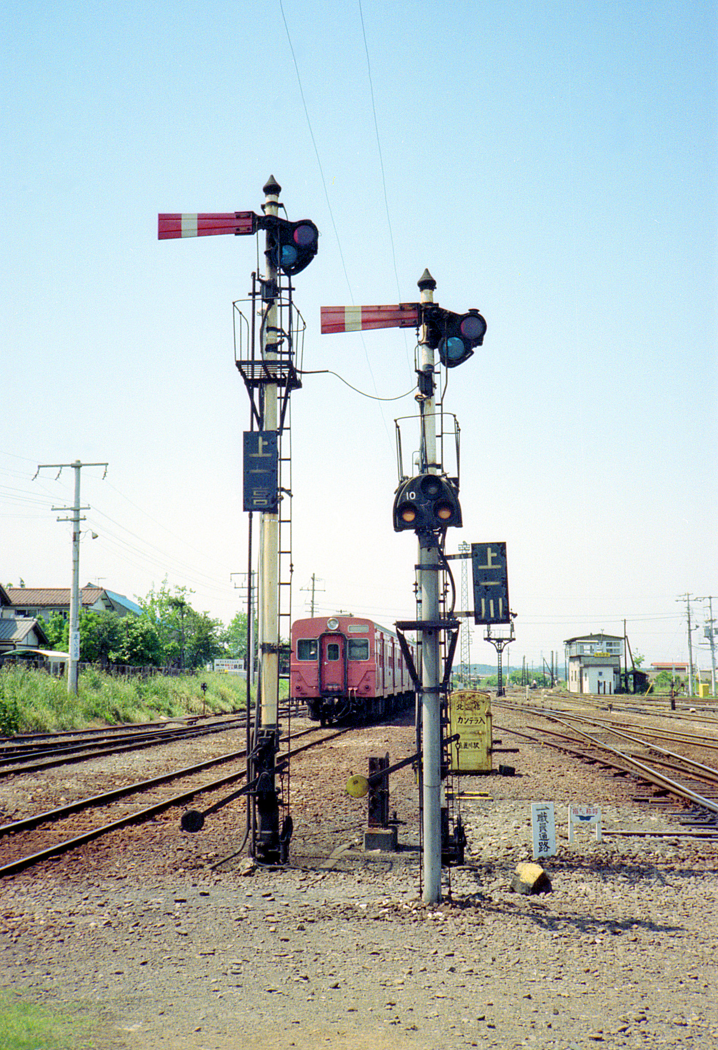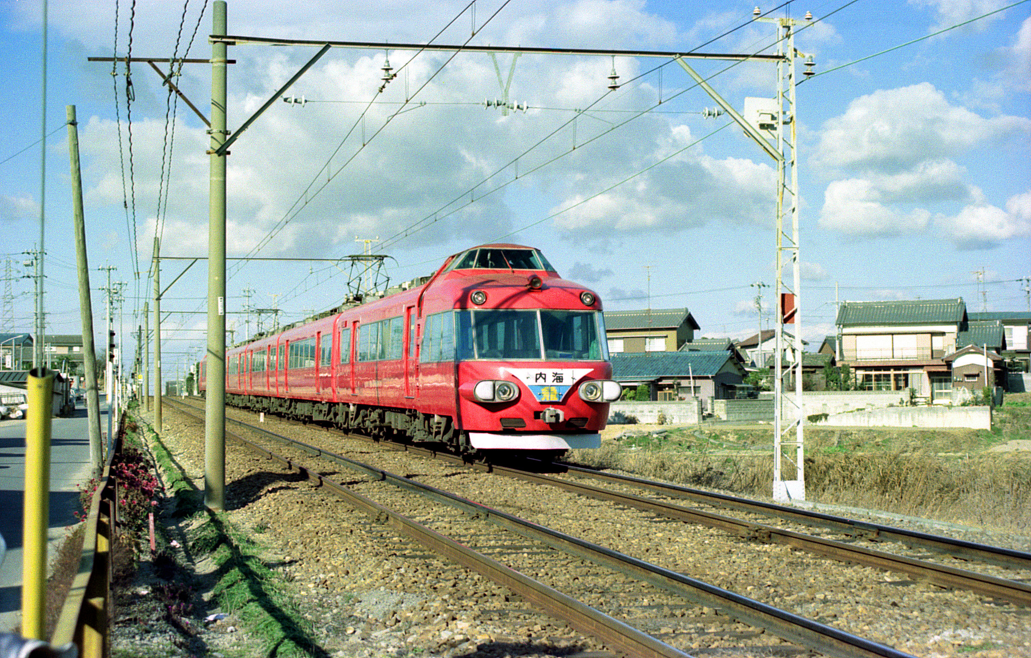 それにしても、次の駅の「上ゲ(あげ)」という名は、珍しい地名の上に、とても不思議な響きですね。由来は諸説あるようです。そちら方向から走ってきたのは、内海行きの急行7000系パノラマカーでした。こうして本線から支線、特急から各駅停車にまで使えるパノラマカーは、運用上も便利な存在だったのでしょう。自分としても、何度見ても大好きな電車です。この日はこの後、国鉄武豊線に乗って名古屋へ戻ります。官設鉄道建設の資材運搬用に、中京地区で最初(明治19年)に開通した鉄道路線ですが、この当時はまだ非電化で、気動車列車によって運行されていました。私鉄派の自分は国鉄には冷淡だったせいでしょうか、武豊線の写真は撮っていません。