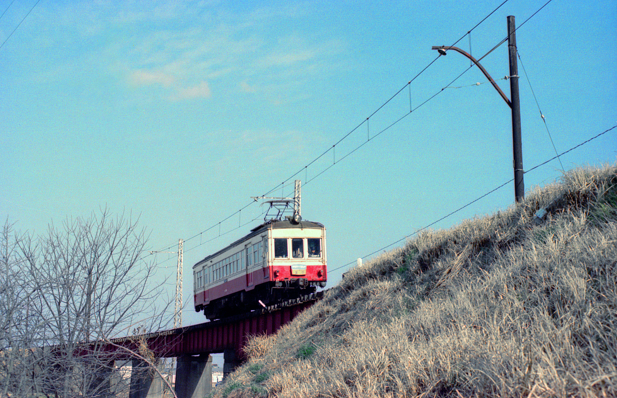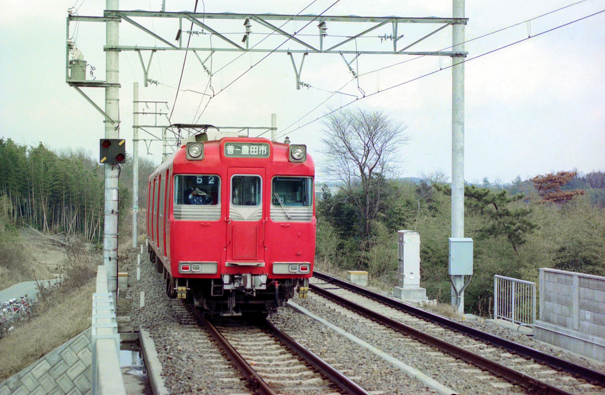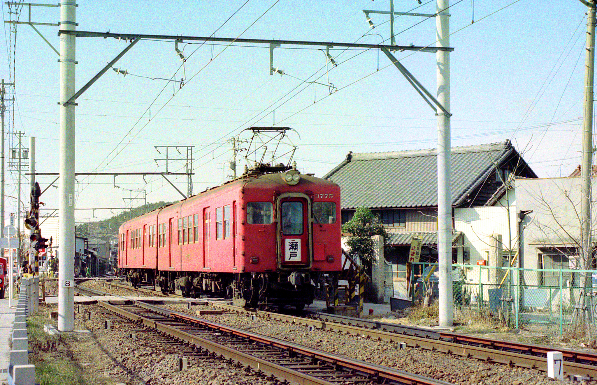 今度は下りの尾張瀬戸行き、3770系(モ3775-ク2775)がやって来ました。元々は本線系の車輛です。3700系の増備として高運転台・両開き扉に変更された3730系の流れを受け、車内をクロスシートとしたのが3770系です。昭和53年の瀬戸線の1500V昇圧に伴い、段階的に全編成が転入して来ました。この編成は昭和54年の3月に入線しています。自分はこの後、名古屋の地下鉄2号線(名城線)に乗って終点の「名古屋港」まで行き、海を眺めてきました。翌日は一人、新幹線で横浜へ帰り、結婚後(と言っても1年も経っていませんが)初めてとなる、一人暮らしが始まりました。「悪いこと」をするには最後の機会(?)かもしれませんが、食事や洗濯だけでも大変で、とても、そんな余裕は…