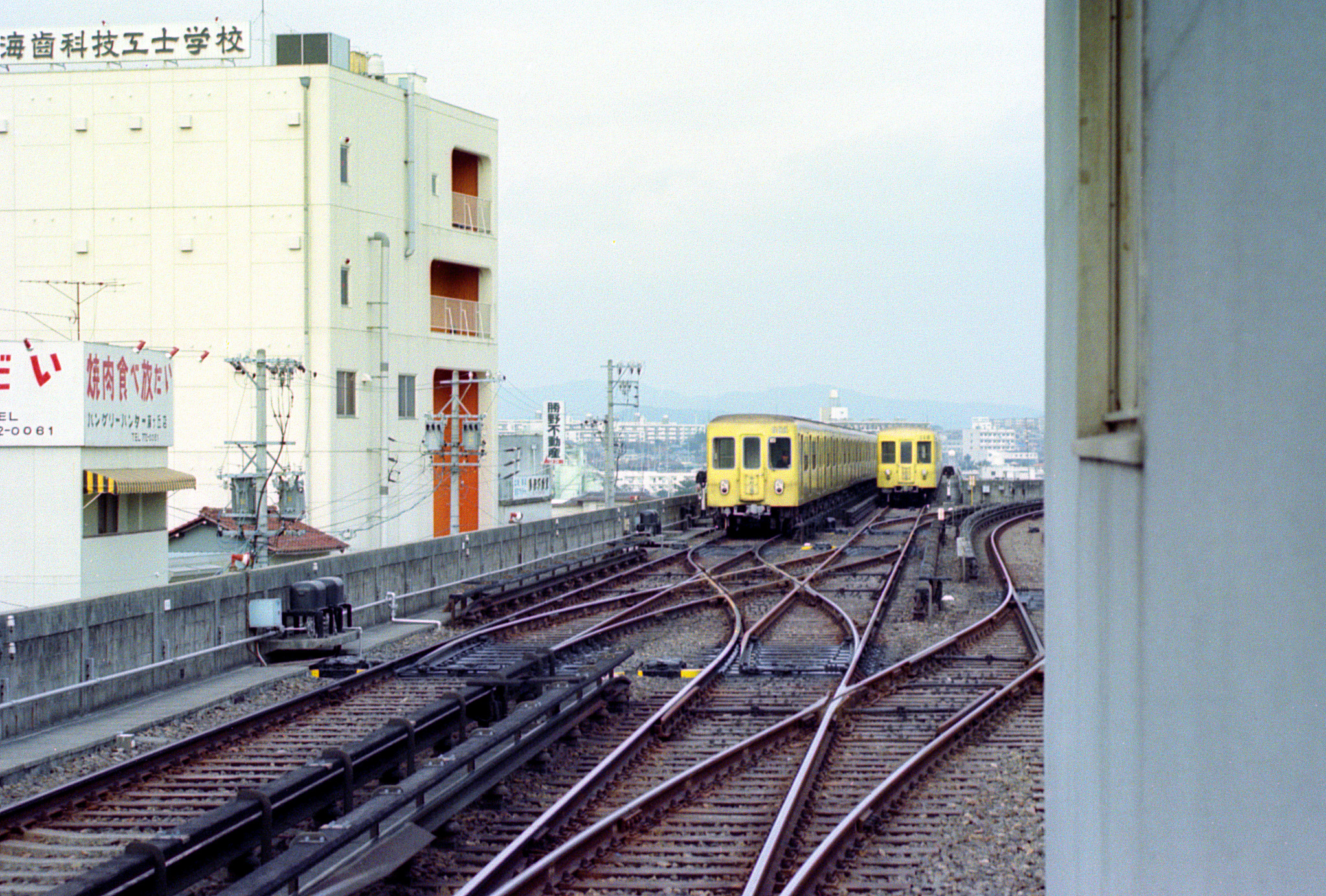 これはまた「映え」ない写真ですね。名古屋市交通局、地下鉄3号線(鶴舞線)の3000形。それだけを見れば近代的なステンレスカーですが、こういう荒涼たる景観の中では、どうにも無機質さが目立ってしまいます。東京の営団地下鉄東西線に似た水色の帯もアクセントとしては弱い色彩で、名鉄の派手なスカーレットとの落差が大きく感じられます。この時代に名鉄が新規開業した路線は「知多新線・豊田新線・羽島新線」と呼ばれましたが、後者の2例は正式には「豊田線・羽島線」で、後にそれに統一され、「新線」が付くのは「知多新線」だけになっています。さて、この後はまた妻や赤ん坊を見舞に病院へ行くのですが、その前に撮ったネガのコマは、意外な場所での写真でした。