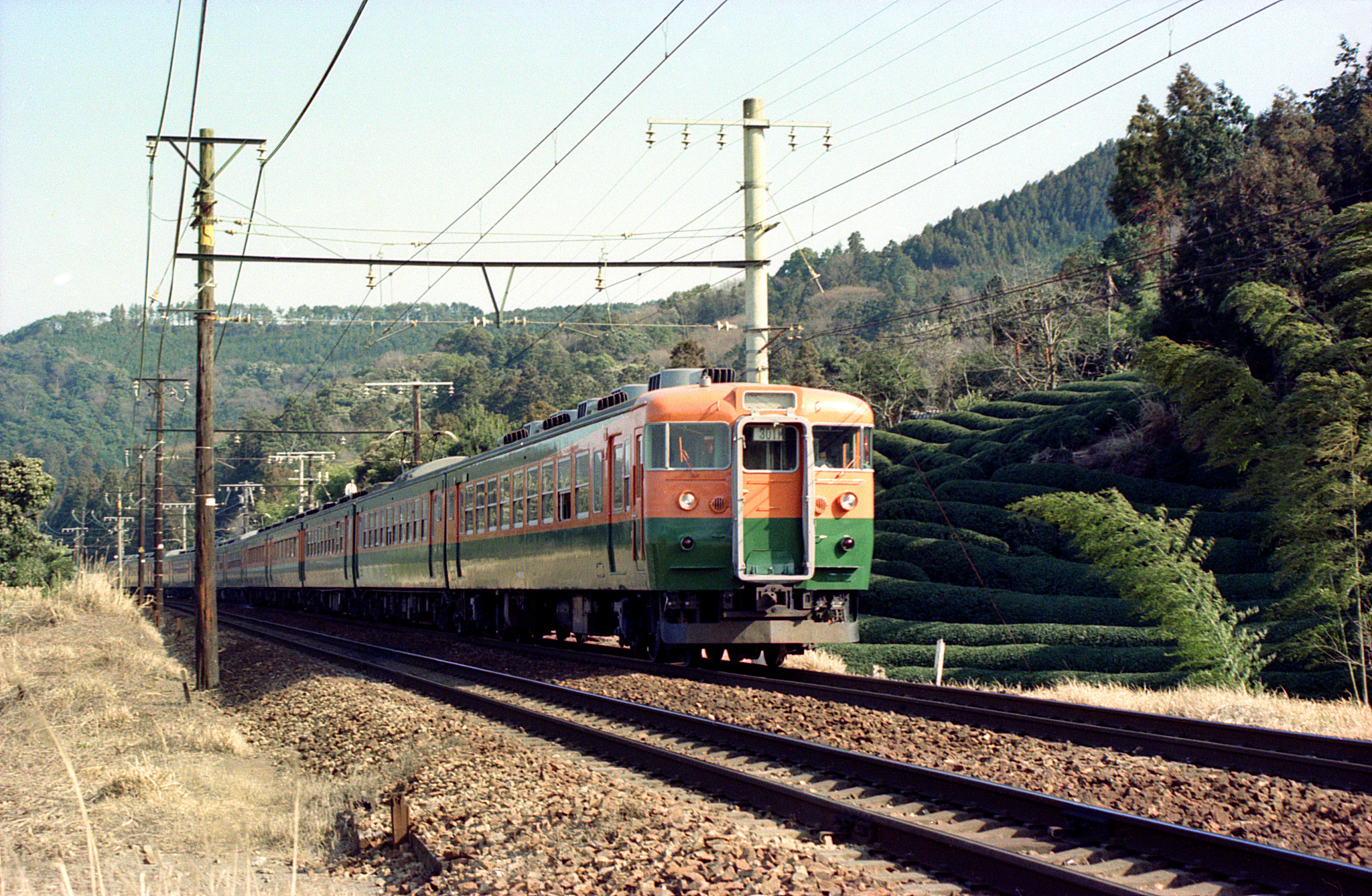 今回は大井川鉄道の写真を撮るつもりで金谷で下車しましたが、東海道本線の線路に沿って歩く途中、下り列車がやって来たので、せっかくですからカメラを向けました。急行形の165系でしょうが、方向幕には(ずれているのか?)「急行」の表示がありませんね。列車番号の「301M」というのは東京発・静岡止まりの急行「東海1号」のようですが、その延長運用とか、浜松への回送とか? シールドビームの「小目玉」ヘッドライトは実用的なのでしょうが、どうにも165系らしくなく違和感を覚えます。4・5両目はグリーン車ですが、まだ薄緑色の帯が巻かれているようにも見えます。線路際の斜面は茶畑。静岡県らしさというか、牧之原台地の特徴が表れていますね。