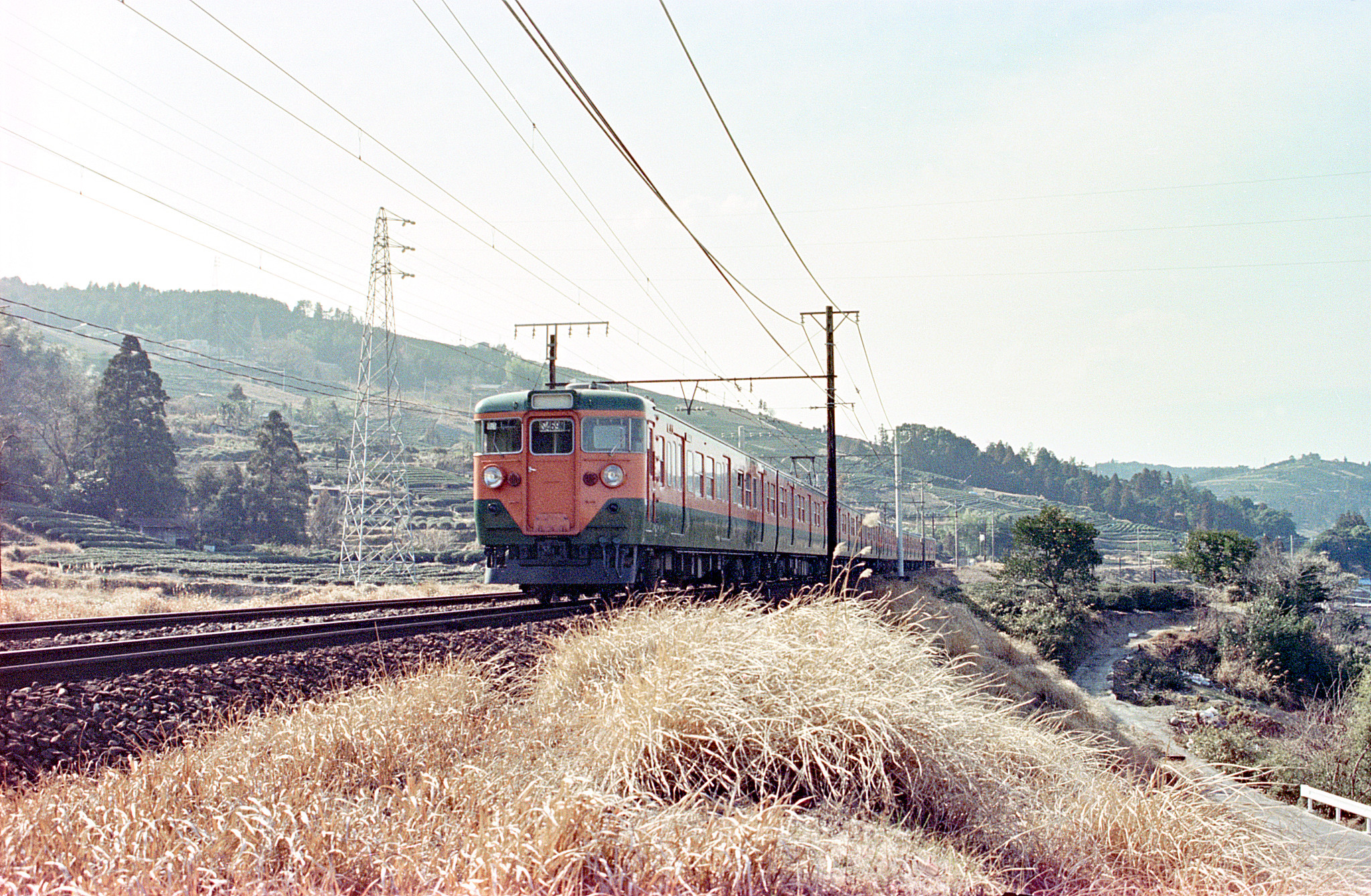 振り向けば、今度は東海道本線の上り普通列車、オリジナルの大目玉ヘッドライトの近郊形113系が走って来ました。浜松発のローカル運用でしょうが、行先は静岡か沼津、または三島か熱海でしょう。表示の無い方向幕は役に立っていませんね。こちら側も山の斜面には茶畑が連なっています。新幹線だと直線区間やトンネルで一気に通り抜けてしまう牧之原台地ですが、在来線は幾つもの大きなカーブを描いて行きます。奥のカーブのあたりから、大井川鉄道の線路は急カーブで画面右へ(金谷からの進行方向で言えば左カーブで160度くらい大きく向きを変えて)去って行きます。この後は、そちら大井川鉄道(大井川本線)の線路を追って行きましょう。