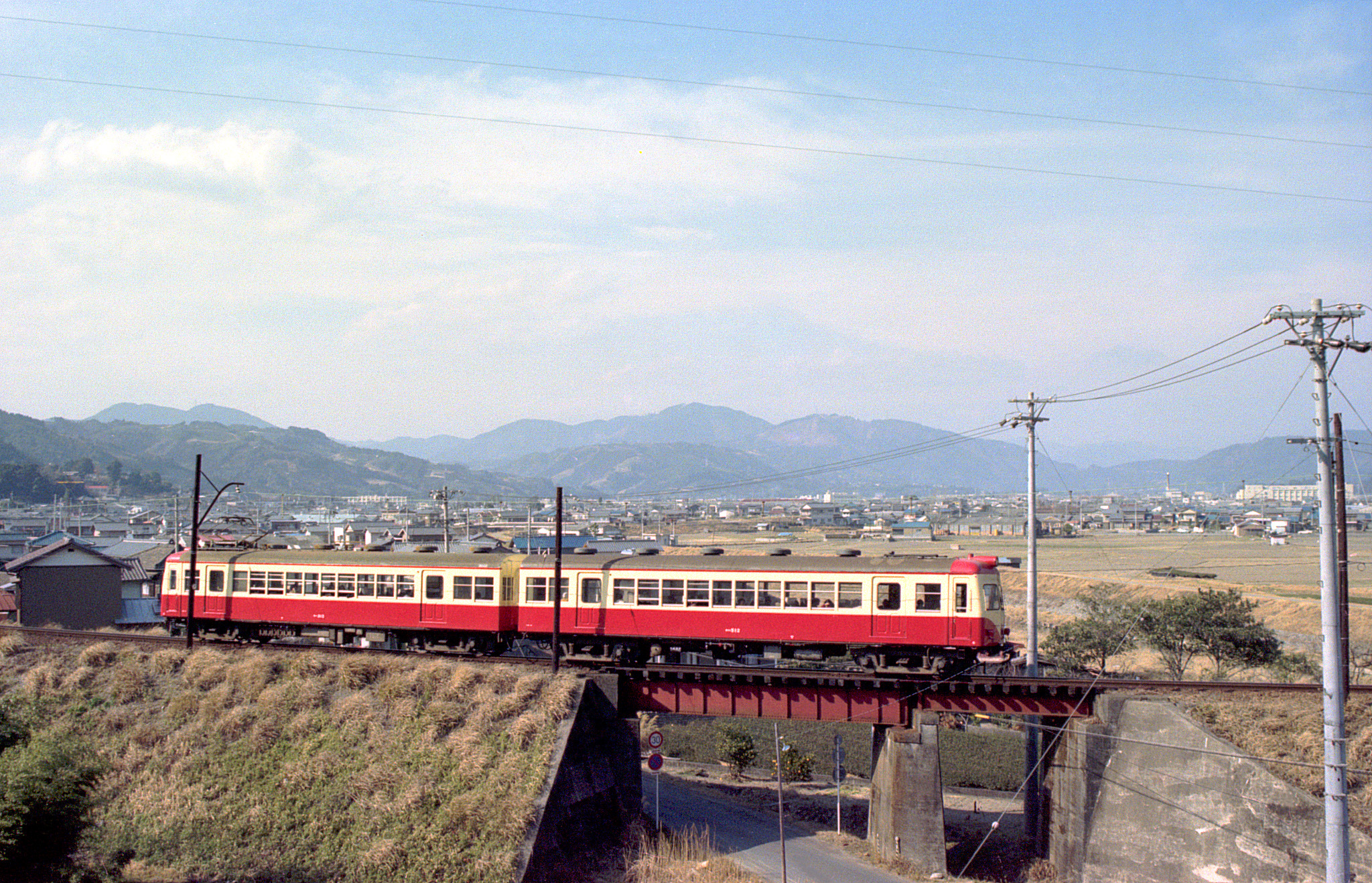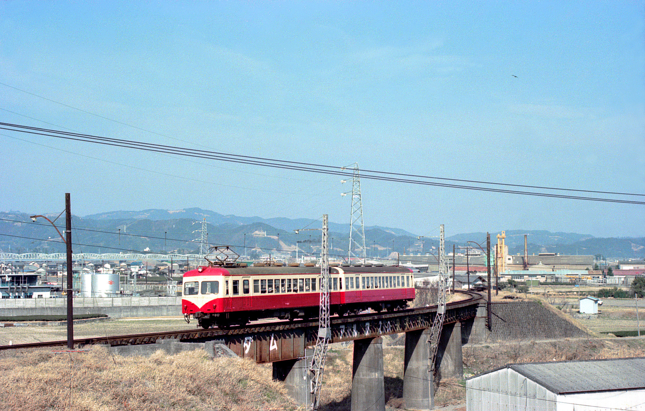 国鉄の金谷駅まで歩いて戻る途中、再び大代川の鉄橋に立ち寄りました。このあたりから撮ったようです。アルミ製の車体を銀色に輝かせながら誇らしげに駆け抜けるのは6010系(モハ6011-クハ6061)。昭和38年に北陸鉄道加南線用に作られた日本初のオールアルミカーで、「しらさぎ」号として活躍しましたが、同線の廃止に伴って昭和46年に、6000系「くたに」号(当地では「あかいし」号と改称)と共に大井川鉄道へ譲渡されました。さて、「配偶者出産休暇」の日をひたすら「鉄分補給」に利用しましたが、翌日からまた仕事と独り暮らしの再開です。そして3月下旬には我が子が名古屋から横浜に「運ばれ」て来ました。新婚・出産で何かと落ち着かなかった昭和55年度も終わります。