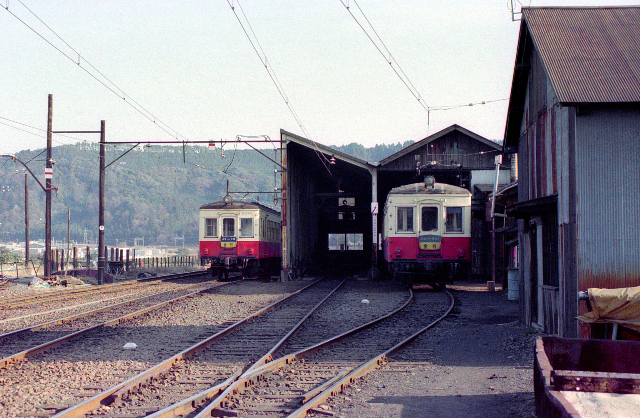 車庫で憩う地味な電車たち。庫外のクハ2829はモハ3829と2両編成を組んでいますが、車体の前歴は名鉄3800系です。前回の訪問の翌年の昭和47年に登場し、車籍は大井川の種車のもの(モハ301-クハ502)を引き継いでいます。先ほどホームにいたモハ3822-クハ2822の編成も、同じく車籍は種車となったモハ308-クハ504のものを継承しているそうです。番号の見えない右端の電車も元は名鉄3800系のようですが、こちらは、他の2編成よりも前(昭和45年)に登場したモハ310-クハ510の編成でしょう。車体だけでなく台車や機器もそのままですが、車内は転換クロスシートに改造され、昭和46年の正月元日から、急行「すまた号」の専用車輛として使用されていました。