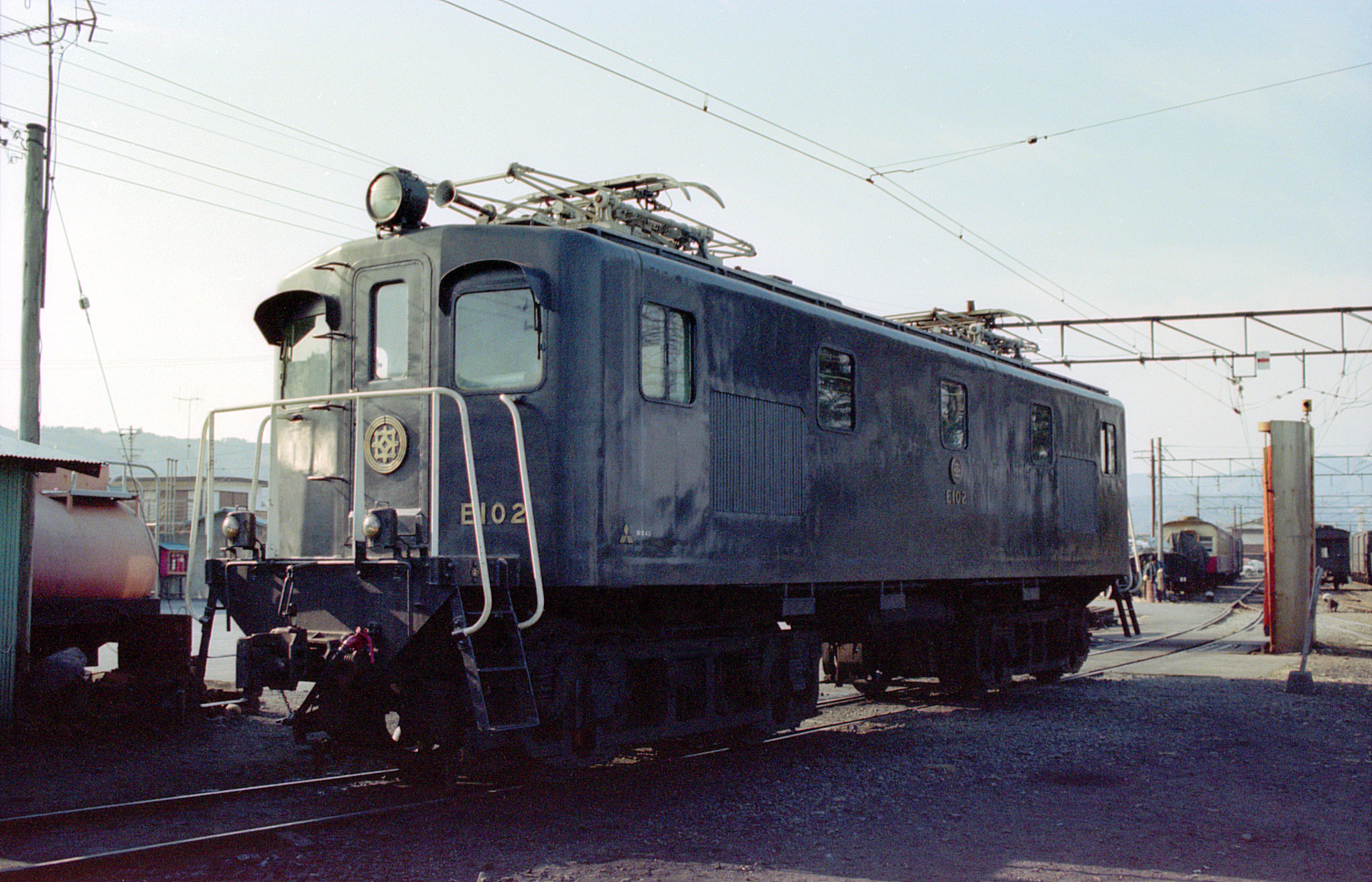 この当時、大井川鉄道では電気機関車が2両だけ働いていたいたようです。E10形のE101とE102で、10年前の訪問時には家山駅でE101と遭遇していますが、E102とは今回初めて対面しました。基本的には同じ形態ですが、こちらE102の方は正面窓に大きな庇が設けられ、表情はかなり異なって見えますね。正面と側面に掲げられた社紋が誇らしげで、私鉄の電機らしさが感じられます。E101は <2269> の写真の右端に写っていましたが、SL急行の運転開始以後は、どちらもその補機として活躍しています。SL列車は人気と共に増発され、一旦は岳南へ譲渡されていたE103も、この後、補機用として戻って来ることになります。更には西武E31形などの電気機関車も導入されました。