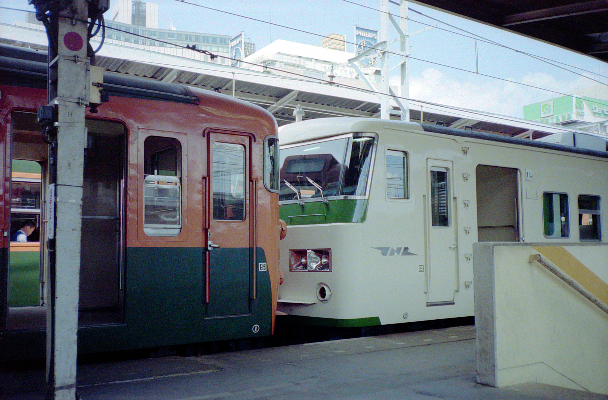 前回の写真が平日だった(?)らしいので、これもその続きだと思いますが、なぜ平日に?…実は、6月2日は横浜市民の休日「開港記念日」なのです。そこから逆に、その日の行動ではないかと思ったのですが…確証はありません。そしてこの場所も…東海道本線の下りホームのようではありますが、自分の中では、「茅ヶ崎」ではなかろうかという曖昧な記憶しかありません。153系と185系の併結を面白く思い、その写真を撮ってすぐに階段を駆け下りたような…。いえ、何となく、そんな気がするだけです。背景のビルも手掛かりになり難く、別の駅かもしれませんが…どうもピンと来ません。どなたか、如何でしょうか? この次のコマがまた唐突に、すっ飛ぶのですが。