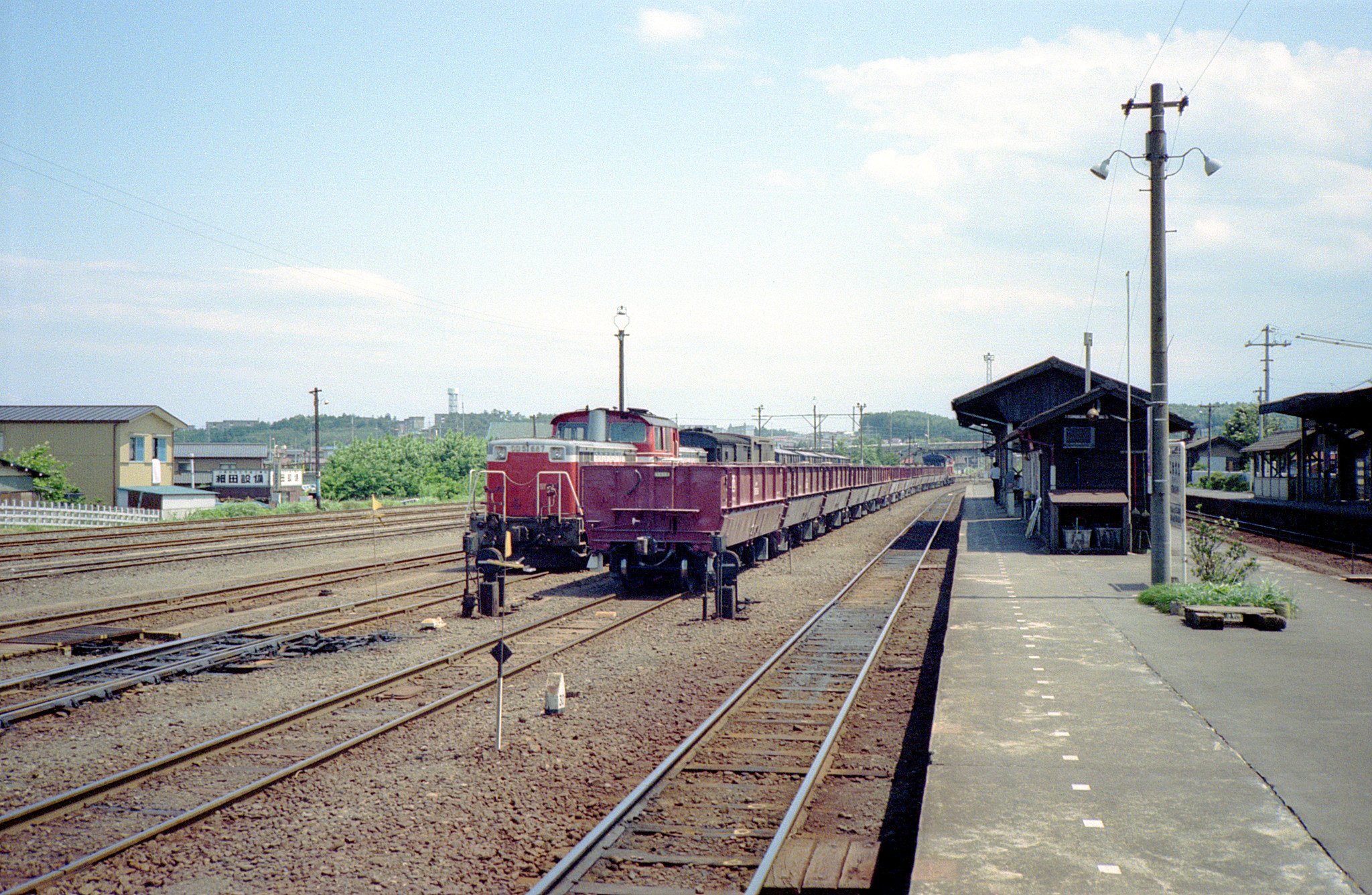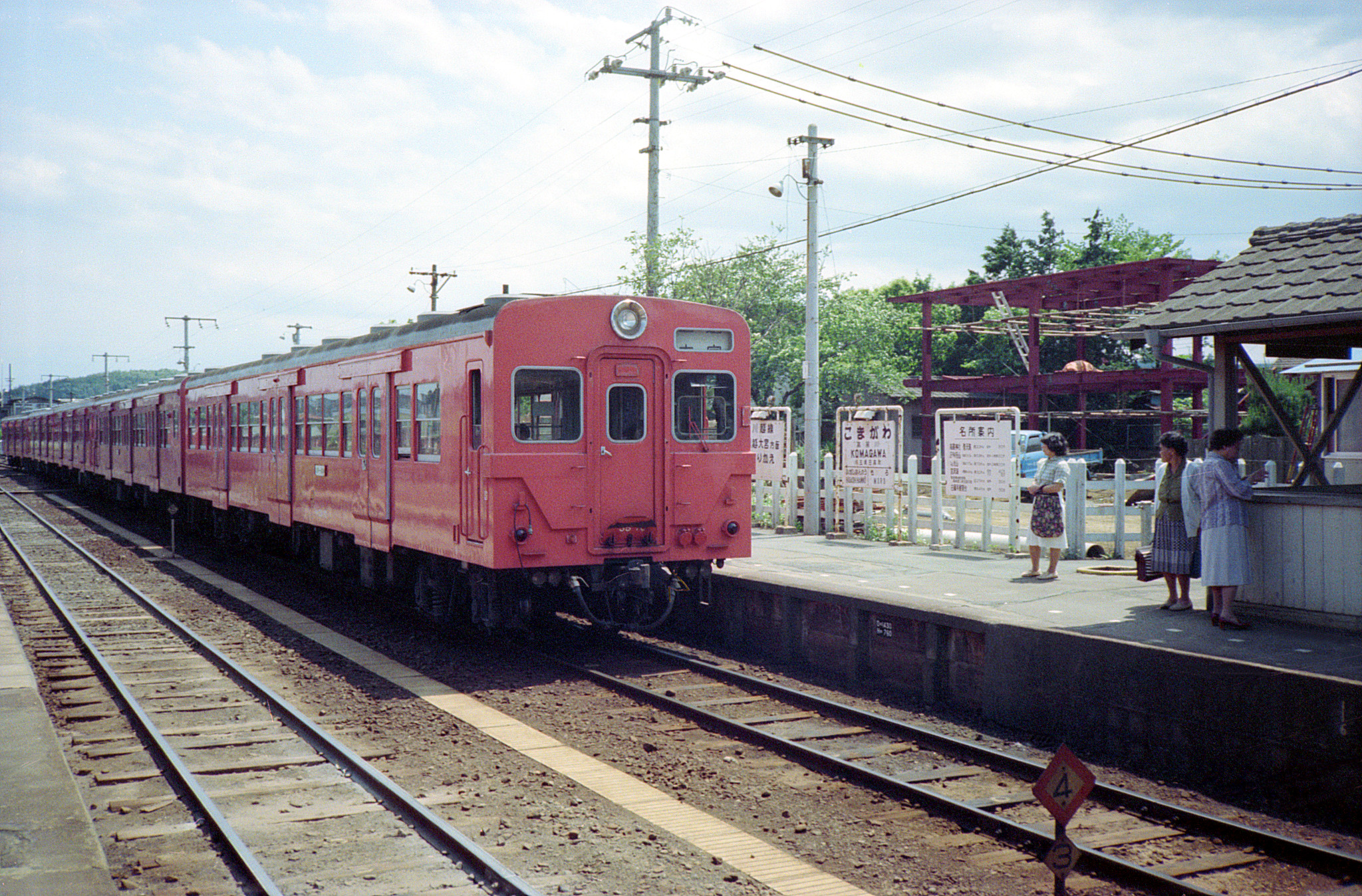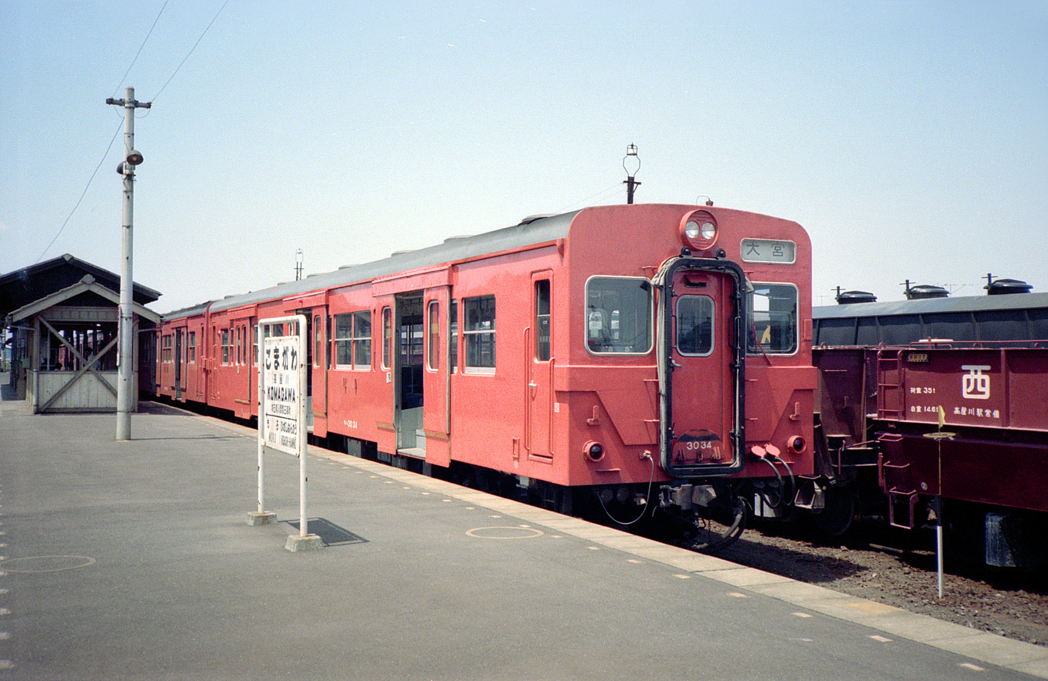 とりあえず「横浜開港記念日」の6月2日か?…ということにしておきますが、5月31日の日曜日かもしれません。そして一気に埼玉県の高麗川駅です。前のコマが茅ヶ崎だとしたら、相模線(横浜線)八高線…と、非電化の気動車を乗り継いで来たのかもしれません(八高線の高麗川以南の電化は平成8年です)が、そのあたりも全く記憶にありません。当時は宮脇俊三さんの『時刻表2万キロ』にハマっていて、各路線の乗り潰しを目指してはいましたが…。ともあれ、写真は高麗川駅に停車中の川越線の列車。当時は大宮まで全線が非電化なので、キハ30形による、通し運転です。前面の補強が無骨ですね。川越線の東半分が電化されて埼京線と一体化されるのは、昭和60年のことです。
