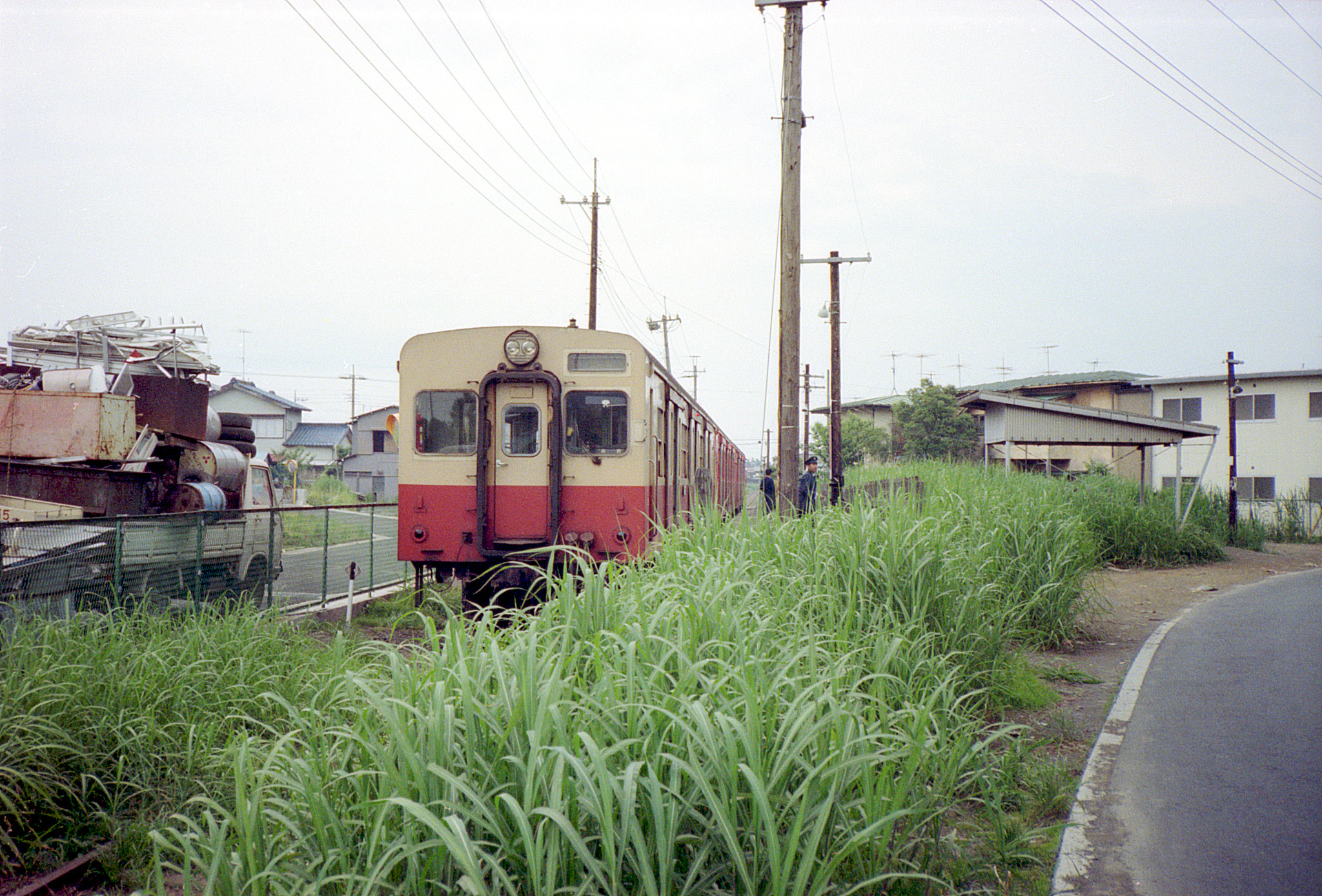 高麗川駅の北側。川越線は右へ90度以上の急カーブで曲がって行きます。直進する八高線との間を割って分岐して行くのが日本セメント専用線。八高線の八王子行き上り列車がやって来ました。これに乗って帰宅したようで、帰路は「高麗川⇒八王子⇒町田⇒大和⇒瀬谷」だったろうと思います。それにしても、生後4か月の赤ちゃんと母親を家に置いて、こんな遠くまで一人で来ていたわけですね。薄情なのか、やむにやまれぬ「鉄魂」なのか…。実際は「お気楽な乗り鉄」だったのだと思いますが、やはり宮脇さんの著作の影響でしょう。この後も、東京近辺で乗り残していた細かい路線群を「乗り潰し」に訪れることになります。そして、この数日後も、ある路線を初めて訪れました。