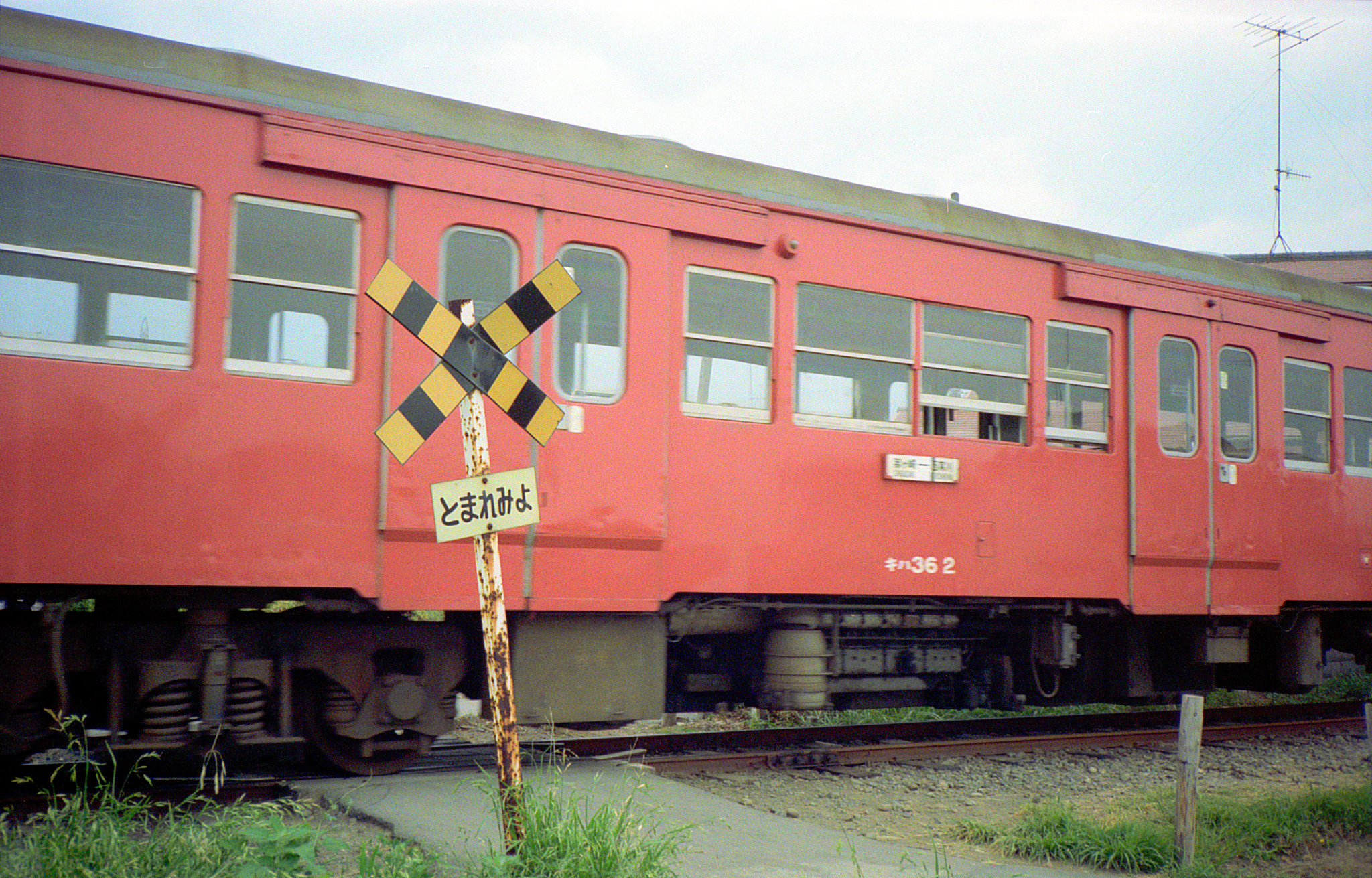 折返しの茅ヶ崎行きには乗らず、発車する列車を見送って撮ったようです。鉄道ファン以外の乗客はいなかったように思います。「第4種」踏切でしょう。ローカル線らしい風景ですね。寒川支線は戦前の「相模鉄道」の時代、大正11年に寒川・四之宮間1.2kmの砂利採取の貨物支線として開通。途中の西寒川は大正12年に「東河原」貨物駅として開業。昭和14年に「昭和産業」駅と改称し、翌15年には当駅までの旅客営業を始めます。17年に「四之宮口」と改称。19年の国有化の際、「西寒川」に改称すると同時に、当駅以遠の貨物営業区間は廃止されました。戦後の一時期は旅客営業が中止されますが、昭和35年に再開。そして昭和59年の3月31日に、路線も駅も廃止となります。