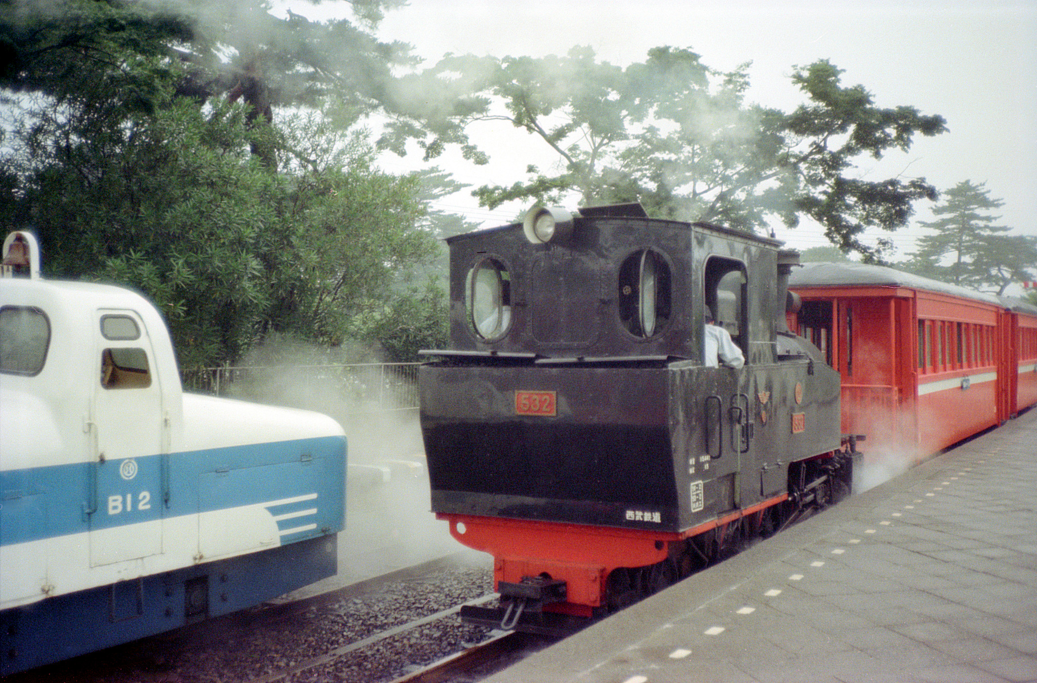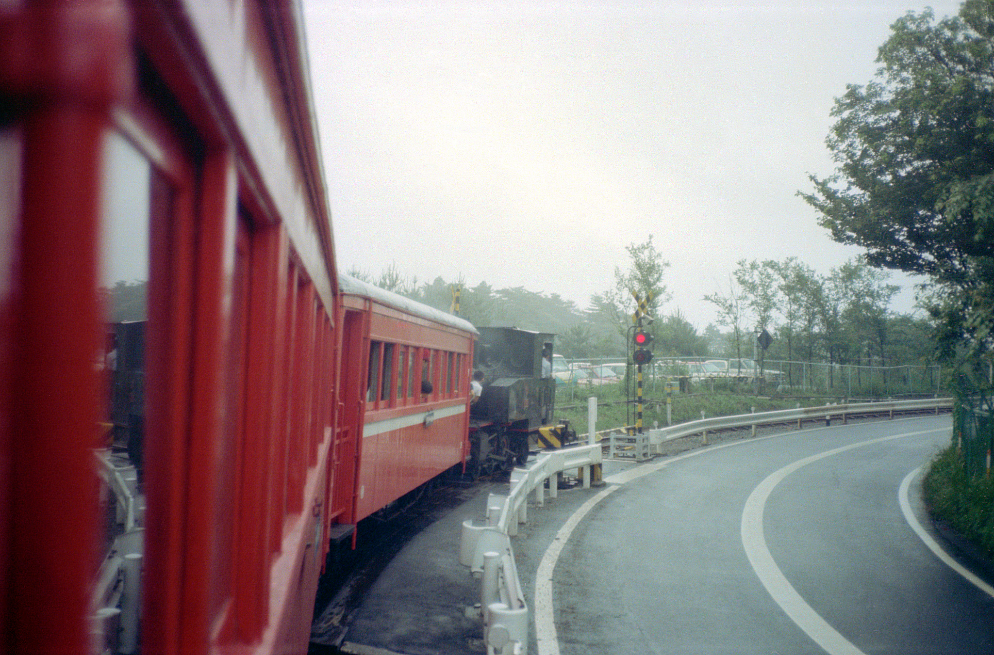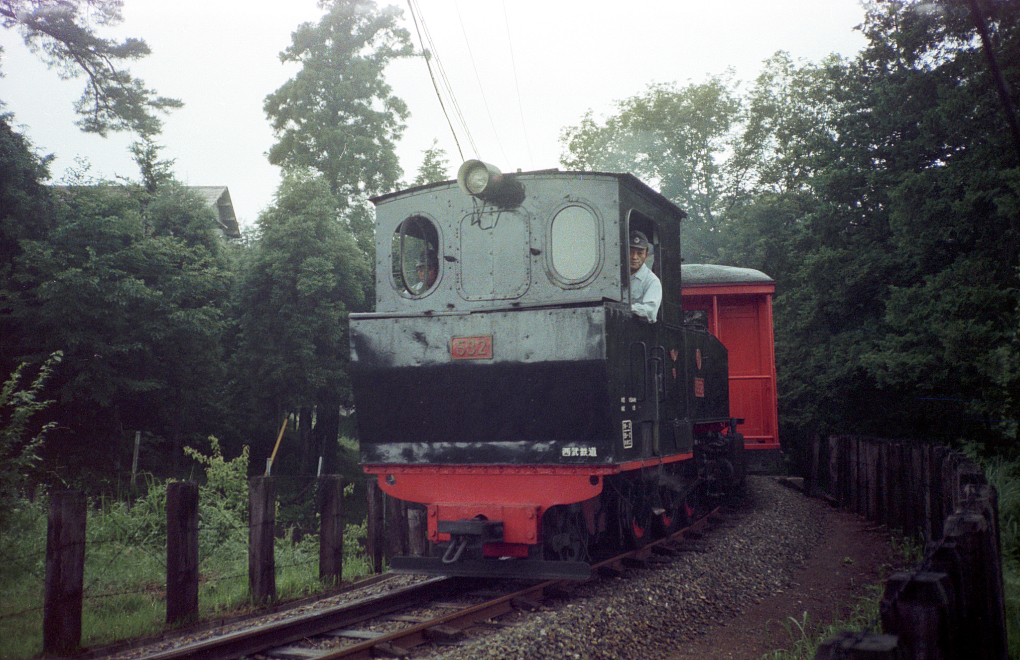 突然登場したミニSL。秋津から西所沢、そして「西武球場前」(昭和54年に「狭山湖」を改称)へと電車を乗り継いで、山口観音(金乗院)に参詣。そこで出会った光景だと思います。このSLは3年前にも見た532号ですが、上り列車なのでバック運転になっていますね。ユネスコ村発・遊園地前行きの列車です。台湾から来た小型の蒸気機関車ですが、SL運転が開始された昭和47年から走っていた1形・2形(頸城鉄道・井笠鉄道から借入)よりも車体が大きめなので、導入にあたっては路線を一時運休して施設の改修をしました。車体裾に記された「西武鉄道」のも文字が誇らしげに見えます。この日はずっと小雨が降り続き、どの写真も煙ったように、ぼんやりしたものになってしまいました。