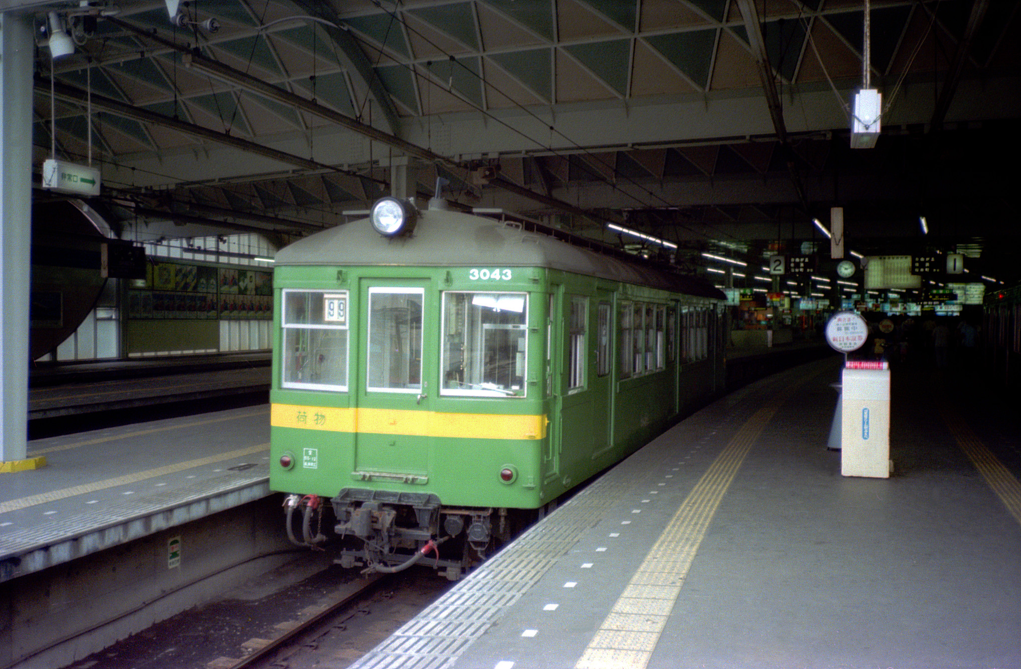 7月中旬の日曜日でしょうか。だとすれば12日か19日。または夏休みに入ってからかもしれませんが、日付の記録がありません。先述の如く、当時は宮脇俊三さんの『時刻表2万キロ』の影響で、全国の完乗は無理としても、鉄道路線をできるだけ乗り潰そうという気持ちが強く、せめて関東地方くらいは制覇したいと思っていました。前途遼遠な、その目標に向けて、この日は東京周辺の私鉄で乗り残していた細かい短距離支線区を片付けるつもりで、一人で出掛けました。瀬谷から横浜へ出て、東横線で渋谷に着いたのでしょう。たまたま見掛けた荷物電車デワ3040形(3043)は、この年にデハ3450形(3498)から改造されたばかり。昨年の夏に見たデワ3042の置換となった車輛です。