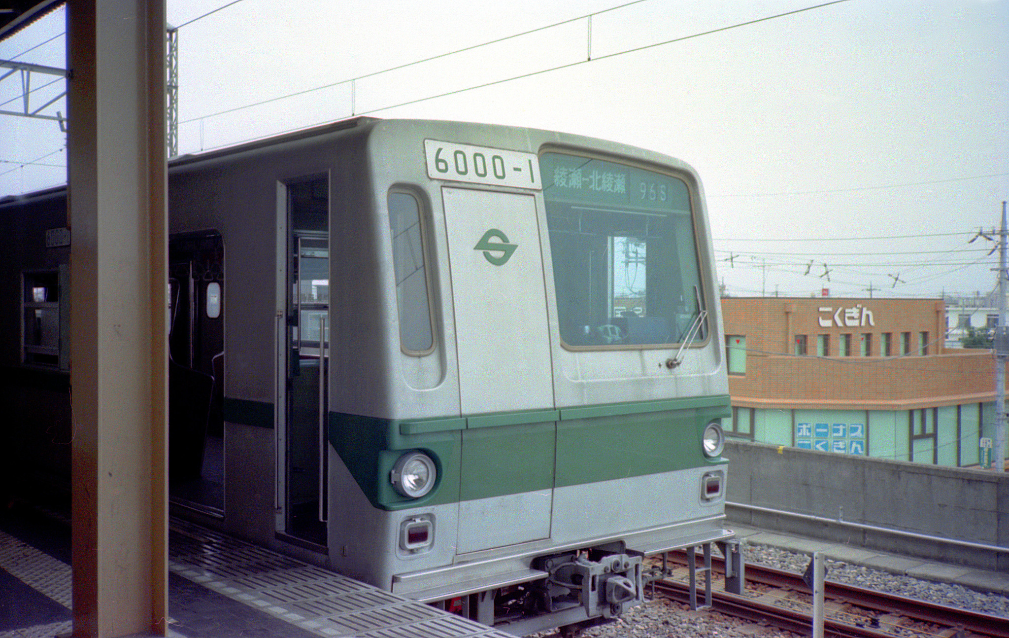 さて、いよいよ東京の私鉄の短支線区めぐり開始です。最初は営団地下鉄千代田線の北綾瀬…ということは、渋谷を出て表参道で乗換え、そこから綾瀬まで延々と千代田線に乗り続けて来たのでしょう。そして綾瀬からは、支線内折返しの北綾瀬行き。本線区間と同じ6000系に見えますが、昭和43年に作られた1次試作車の3連ですね。当初は6001~6003を名乗りましたが、後に6000-1~6000-3という編成になり、「6000-系(6000ハイフン系)」とも称されるそうです。いずれにせよ、登場時は、サイリスタチョッパ方式や未来志向のデザインが大きな話題となりました。車体裾はスカートで覆われ、前面の緑色の帯も左右のライト部分にだけ施され、かなり印象の異なる表情でした。