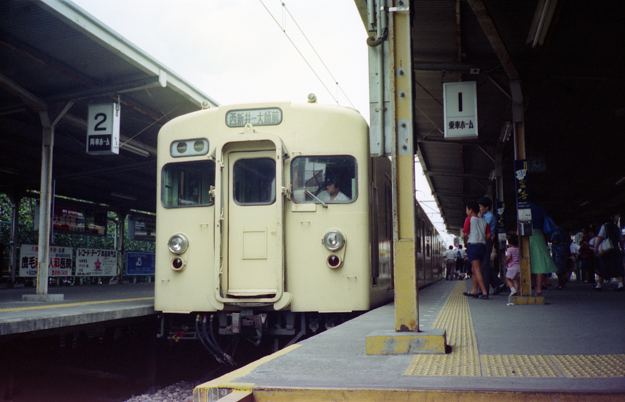 ガラッと雰囲気が変わって、今年も夏。梅雨明け前の金曜日に、初めて我が子を連れて、調布の実家を訪れました。6月中は修学旅行の準備や引率などで忙しく、なかなか行く機会がありませんでしたが、7月4日の土曜日は半日分の年休を取ったのでしょう。両親にとって初の「内孫」を実家に置いて、ひさしぶりに妻と二人で出掛けました。僕のことなので、マニアックな行楽です。京王線で府中へ行き、府中本町から武蔵野線に乗ったと思われます。下車したのは「新秋津」駅でした。当時はオレンジ色の101系で運行されていた武蔵野線。方向幕は「府中本町-西船橋」と表示されているらしく、「本町」と「西」は小さな文字になっています。さて、この駅で下りたなら、もちろん次は…?