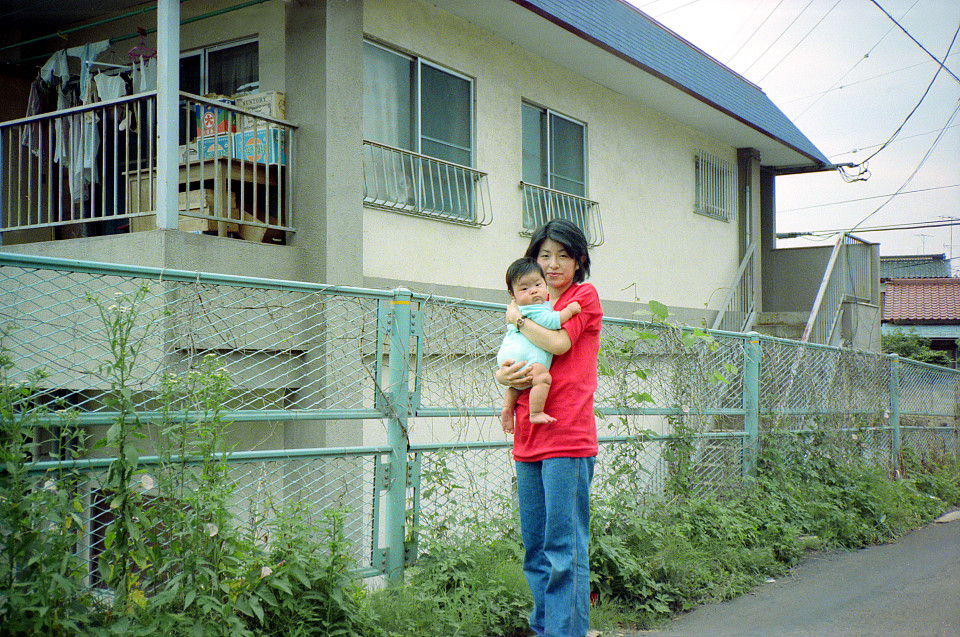 キハ35系の車内から、草深いホーム上の駅名標を撮ってみました。典型的な短距離(1駅間)の盲腸線で、いかにもローカル線の終点に相応しい、行き止まり表示。列車の本数も駅の利用者も少なく、それに加えて、近い将来の廃止が噂される赤字路線です。それにしても、この日も平日(木曜日)ですね。日付は確かなようで、たまたま午後が空きの日だったのか、それとも休みを取ったのか、そのあたりの経緯も全く覚えていません。「未乗路線」踏破のために、この日も妻子を家に残して行くので、せめてもの慰め(?)に、アパートの前で母子の写真を撮ってから出掛けました。この子も将来「鉄ちゃん」になってくれれば、父子連れ立って「電車乗り」に行ける日が来るかもしれませんね。