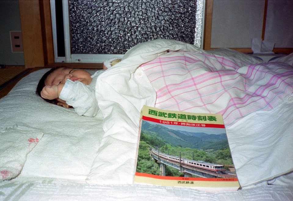 遊園地前駅に到着した上り列車は乗客を降ろした後、入換をして、下り方の先頭に機関車を付け替えます。転車台が無いので上り列車は逆向きで牽引して来ましたが、下り列車はボイラーを前にした蒸気機関車本来の向きで運転するのでしょう。客車(31形)はSL列車の運転開始に合わせて井笠鉄道から譲り受けたオープンデッキの木造車で、8両いました。31~34はダブルルーフ、35~38は丸屋根ですが、この列車の2両は後者ですね。左端には蓄電池機関車B12の姿も見えます。さて、そろそろ夫婦の行楽を終えて調布の実家に戻ります。その間、預けておいた我が子は西武の時刻表を眺めていた…はずがありませんね。翌日は親子3人で、横浜・瀬谷の我が家へ帰りました。