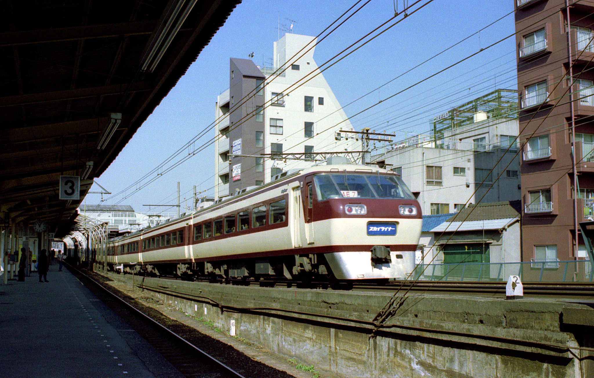 前回201系の写真を撮った東京駅の3番線ホームから京浜東北・山手線の電車に乗り、日暮里まで来たのでしょう。例によって、跨線橋で常磐線の3番ホーム(京成の1・2番から連番なのですね)へ移動して、京成の線路を眺めます。この場所と言えば11年前、京成のカラー写真を初めて撮った日を思い出しますが、今、目の前を駆け抜けた電車は、その頃には思いも寄らなかったデザインのAE車、スカイライナーです。この当時、日暮里駅はまだ通過していましたが、翌年の昭和58年10月から上り列車に限って停車するようになります。更に後の平成3年からは全列車が日暮里停車となり、成田空港への都心側のアクセス拠点は、事実上、京成上野から日暮里に変更されました。