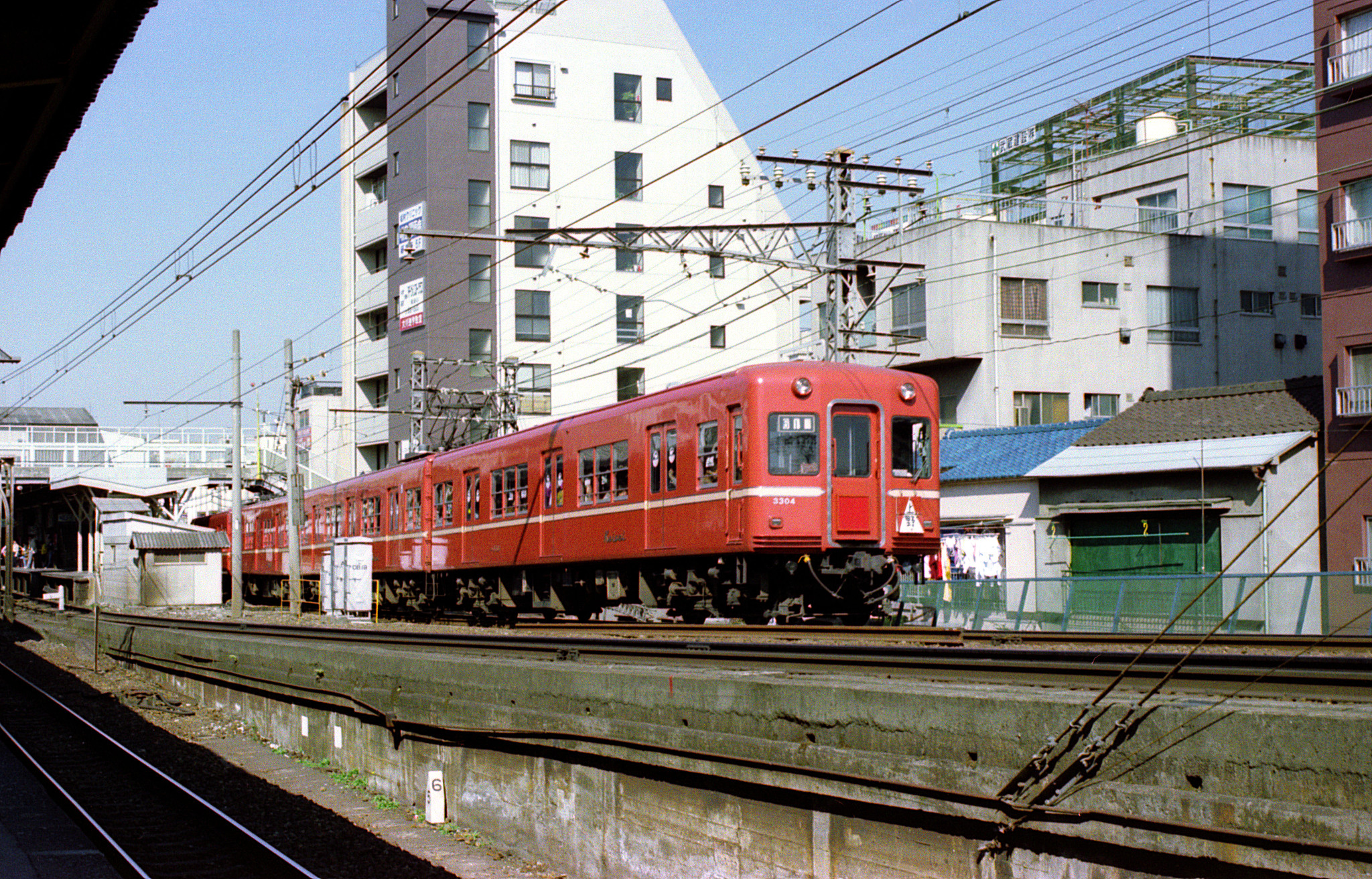 京成上野へ向かう上り電車は3300形。いつの間にか「ファイアーオレンジに銀枠付きのアイボリーの帯」という塗装に変わっています。同じ3300形でも、7年前の写真では「赤電」と呼ばれる塗装でしたが、それ以上に「赤い」電車になったのですね。3300形の中でも、3304の編成は方向幕の無い1次車。この後の冷房化も3300形の中では最も遅く、5年後のことになります。その後に方向幕も設置され、更に平成元年には車体が更新改造されて、前照灯は前面腰部の左右へ移設され、表情が大きく変わります。尚、京成のこの区間の路線名は、昭和56年度版までの『民鉄要覧』では「上野線」とされていましたが、57年度版以降は「本線」と記されるようになりました。