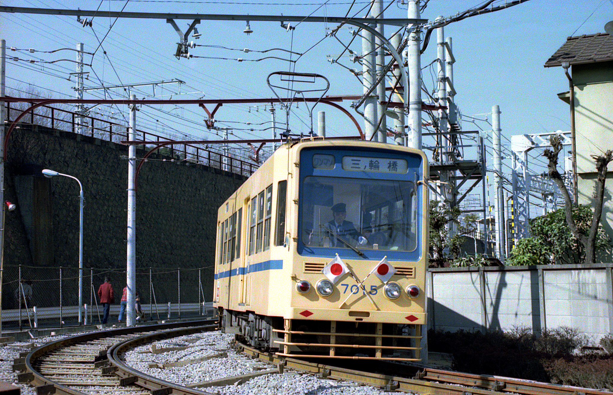 国鉄に沿った都電の線路が大きく左へ逸れて栄町方向へ曲がって行くカーブを、更新7000形が走り抜けて行きます。この新しい7000形を初めて見たのは4年前ですが、その時に早稲田で撮ったのも、この7015号でした。優雅な丸みを帯びたスタイルだった7000形が、一転して直線的なデザインに変わってしまい、最初は違和感を覚え…いえ、それは今も変わりませんが、7000形だと思わなければ、これはこれで「新しい都電」なのだとは思えるようになってきました。王電三ノ輪線の開業時(大正2年)には、この右手あたりが三ノ輪からの終点(飛鳥山下)となっていました。そのまま画面左へ直線で延伸し、地上を走る国鉄を高架で乗り越えて、飛鳥山はトンネルで抜ける計画があったそうです。