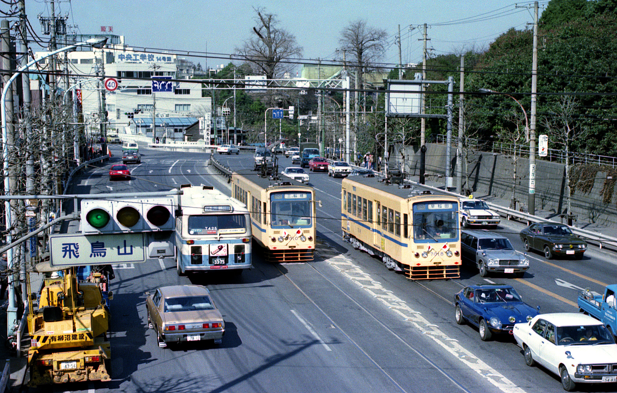 飛鳥山交差点の歩道橋の上から、明治通りを見下ろします。この下り坂は「飛鳥大坂」と呼ばれるそうですが、大きく右へカーブして、国鉄のガードを潜ります。カーブの向こうは石神井川の谷ですが、本流はトンネルになって道路下を通っていて、旧流路は音無親水公園として残され、画面奥を左へ向かう道路の橋として、御茶ノ水の聖橋に似た立派なアーチの「音無橋」が架かっています。この区間の都電の線路は、以前は上下線とも(写真は坂を上る電車)、坂を下る側の自動車の車線に敷かれていて、逆走のように見られる場合もある変則的な箇所となっていました。荒川線になって改善された道路を行き交う都電は、三ノ輪橋行きの7010(元7064)号と、早稲田行きの7018(元7072)号。