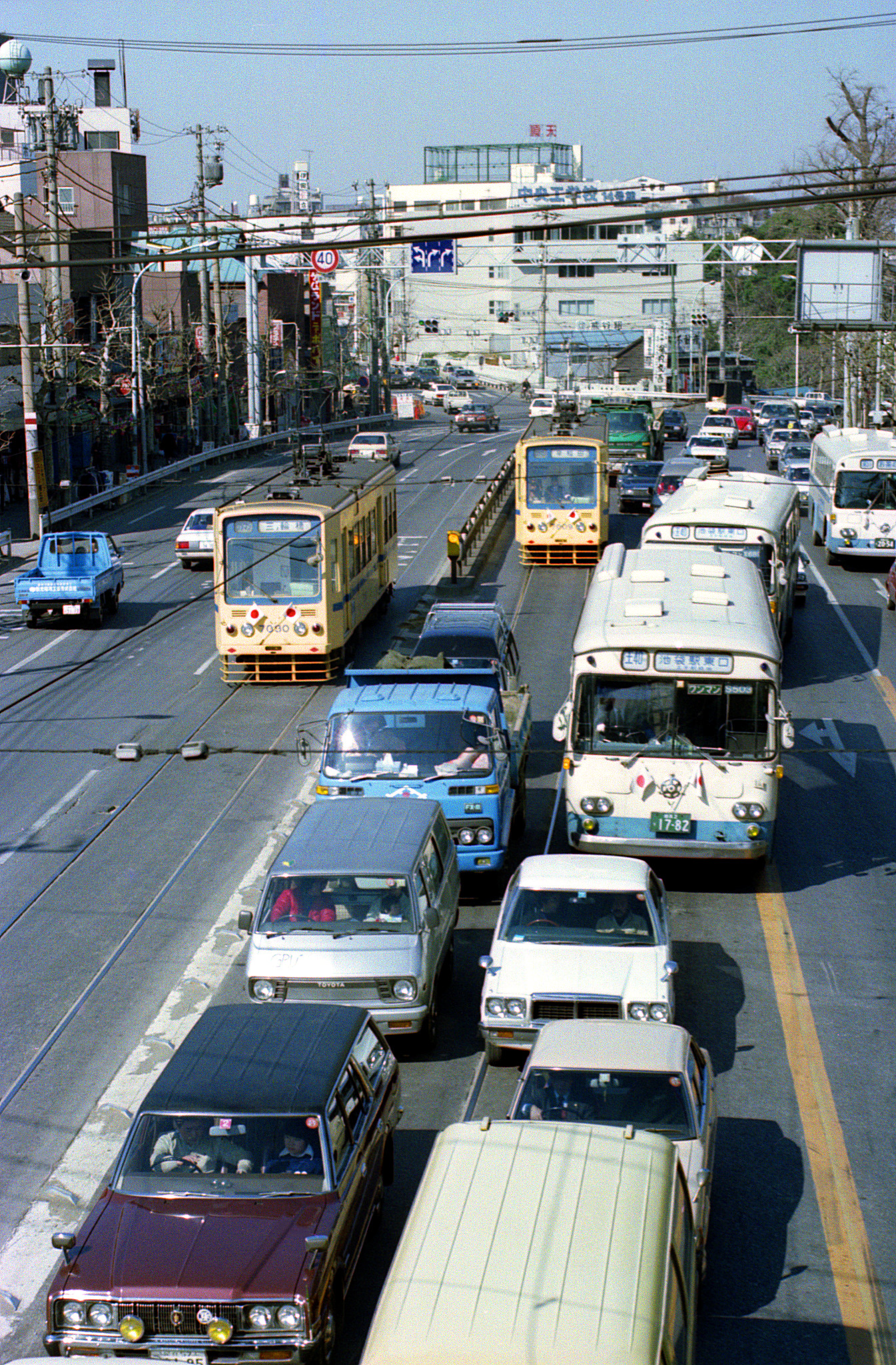 前回と同じ歩道橋の上で、少し北へ寄った場所から同じ方向を望んでいます。画面奥で分岐している道が旧・岩槻街道で、そこに架かるのが音無橋。石神井川の元の流れは、この年に2本目の捷水路(ショートカット)のトンネルが竣工したことによって全てそちらへ移り、橋の下の流れは無くなって、先述のように「音無親水公園」として整備されました。今回行き交う都電の更新7000形は、三ノ輪橋行きの7030(元7087)号と、早稲田行きの7009(元7063)号。また、都営バスの運転系統は全く把握していませんが、併走するのは「王40:西新井駅-池袋駅東口」のロングラン系統のようです。右端に半分見えている車体の方向幕表示は「お茶の水駅」と読めそうですが、さて…?
