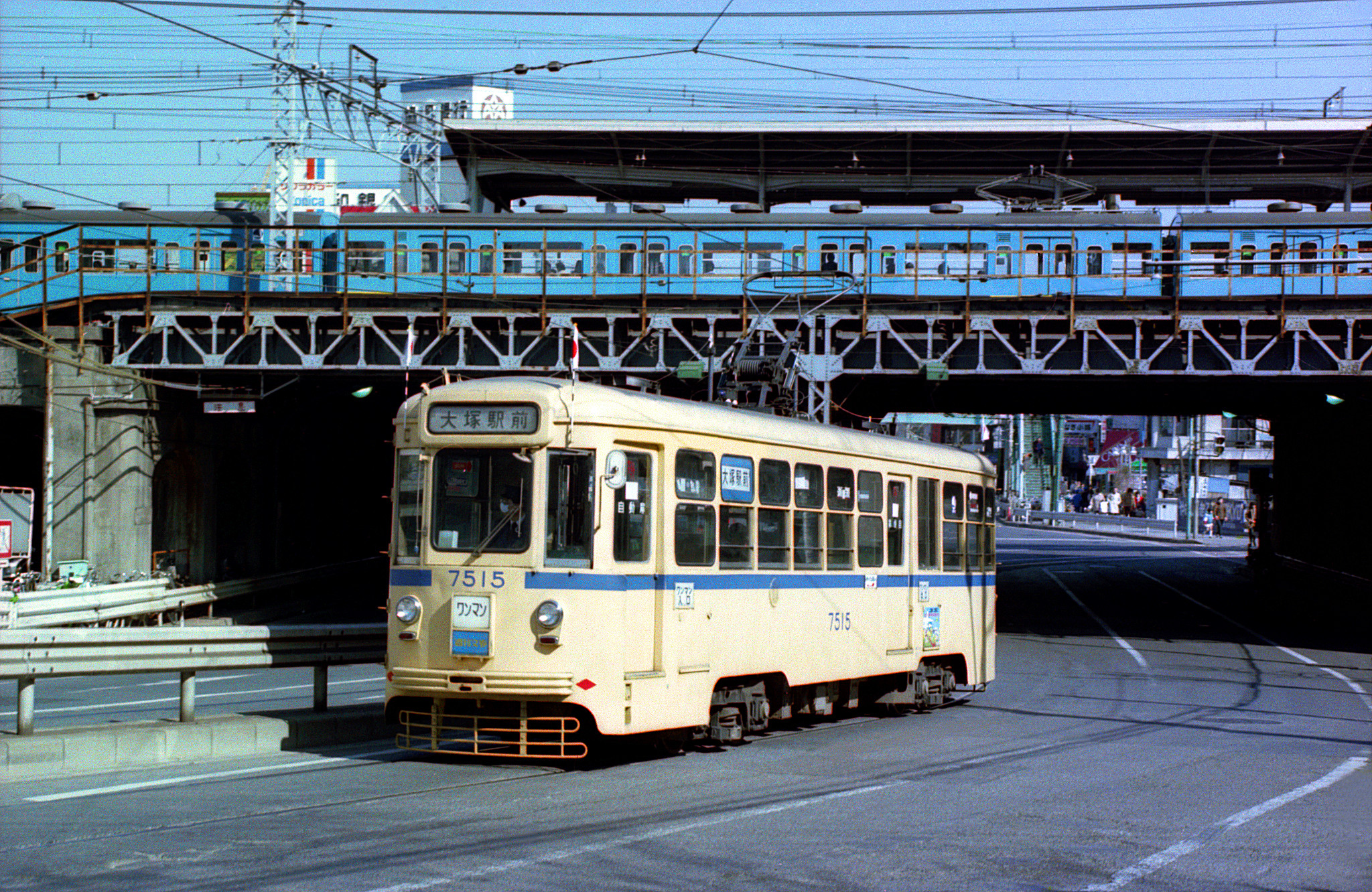飛鳥山を下って、国鉄のガードまで来ました。これから飛鳥大坂を上る都電は「大塚駅前」行き、青帯ワンマンカーの7515号。同じ車輛を6年前に大塚駅前で見た時は、「荒川線」ではあっても、まだ赤帯の「都電」でした。ガードの上を行く国鉄は、11年前の写真では貨物列車でしたが、今回は京浜東北線スカイブルーの103系。でも、103系自体は、当時と比べて全く変化していませんね。この時代になっても、鉄道・軌道、そしてバスも含め、公共交通機関にはまだ非冷房車が多く見られました。「昭和」も残り少なくなったとは言うものの、あと7年は続きます。この頃の鉄道風景には、まだ、どこかホッとさせられるものがあったように思えます。