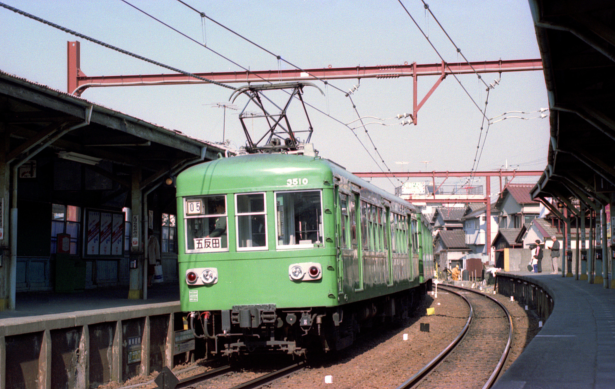 自分にとって池上線の「乗り潰し」は、この当時、既に完了していたはずです。この日は、沿線で少しだけでも写真を撮ろうとしたのでしょう。五反田から電車に乗ってみて、途中の「荏原中延」駅のカーブしたホームの感じが良かったので、下りたのだと思います。発車して行く上りの五反田行きの最後尾は、3500形でした。先ほど五反田で見た3650形同様、いかにも更新車という風貌が印象的ですね。目蒲線を走る更新前の姿を10年前に多摩川園前駅で見た際にも記したように、3500形は元は東京横浜電鉄のモハ1000形で、将来は湘南電気鉄道に乗入れる構想があったために、改軌しやすい長軸台車を採用(3650形も同様)。また、加速が滑らかな多段制御器も搭載されていました。